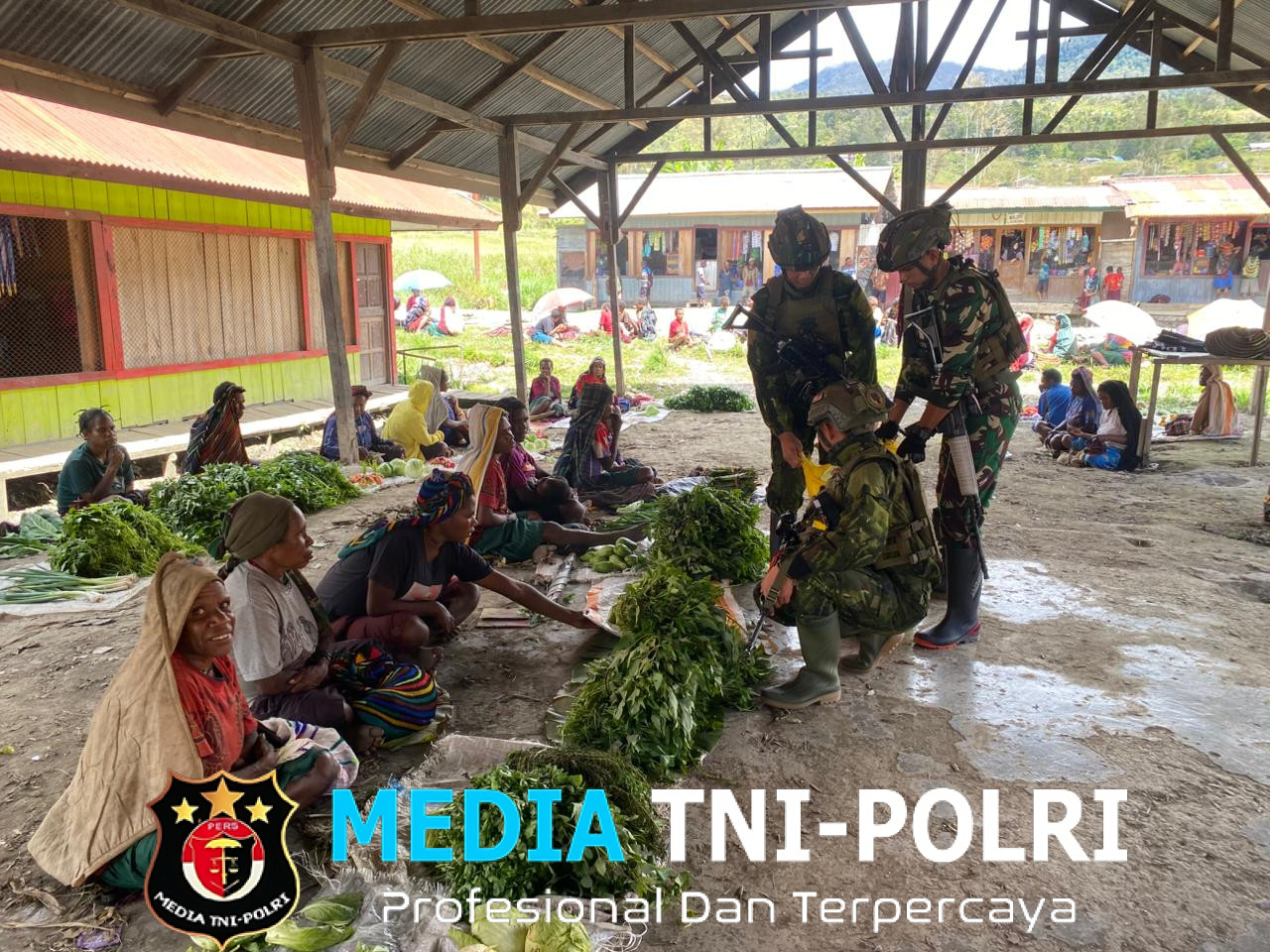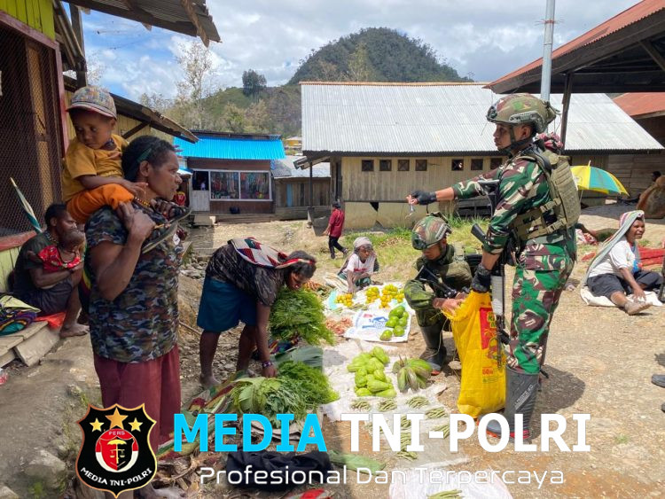 SINAK // MEDIATNI-POLRI.COM / Suasana pasar tradisional di Distrik Sinak tampak berbeda dari biasanya. Beberapa prajurit TNI dari Satgas Yonif 700/Wira Yudha Cakti yang tergabung dalam Pos Kout Sinak tampak aktif berinteraksi dengan para mama-mama Papua sambil memborong hasil tani lokal. (12/5/2025).