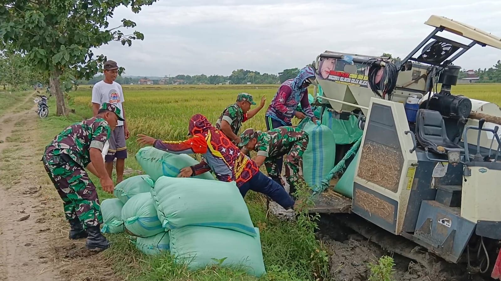 Baru-baru ini, Babinsa bersama warga Desa Mojorejo bahu-membahu melakukan panen padi menggunakan mesin Combi.