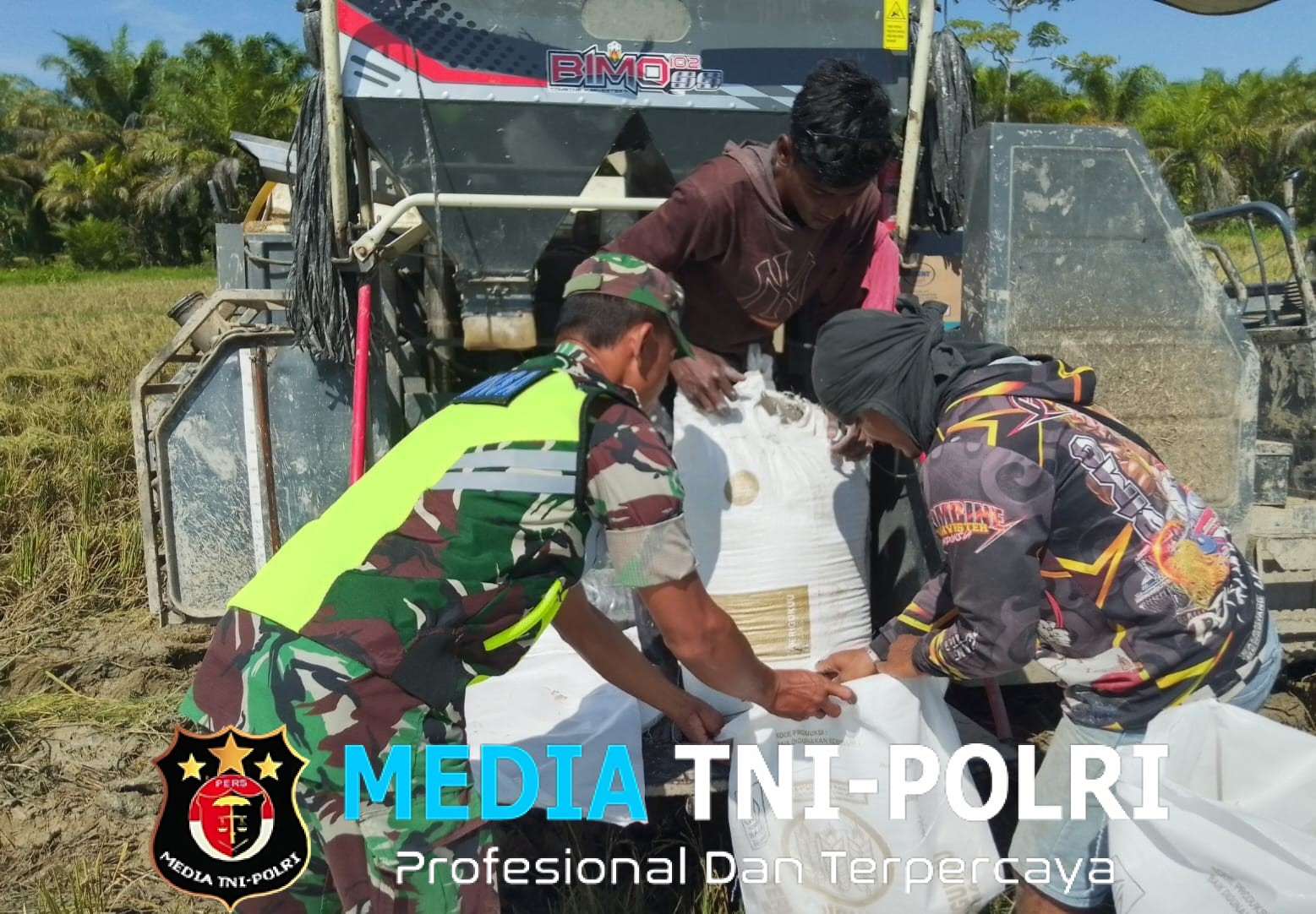 Sertu Khaedir tampak turun langsung ke sawah membantu proses pemotongan dan pengumpulan hasil panen bersama warga lainnya.