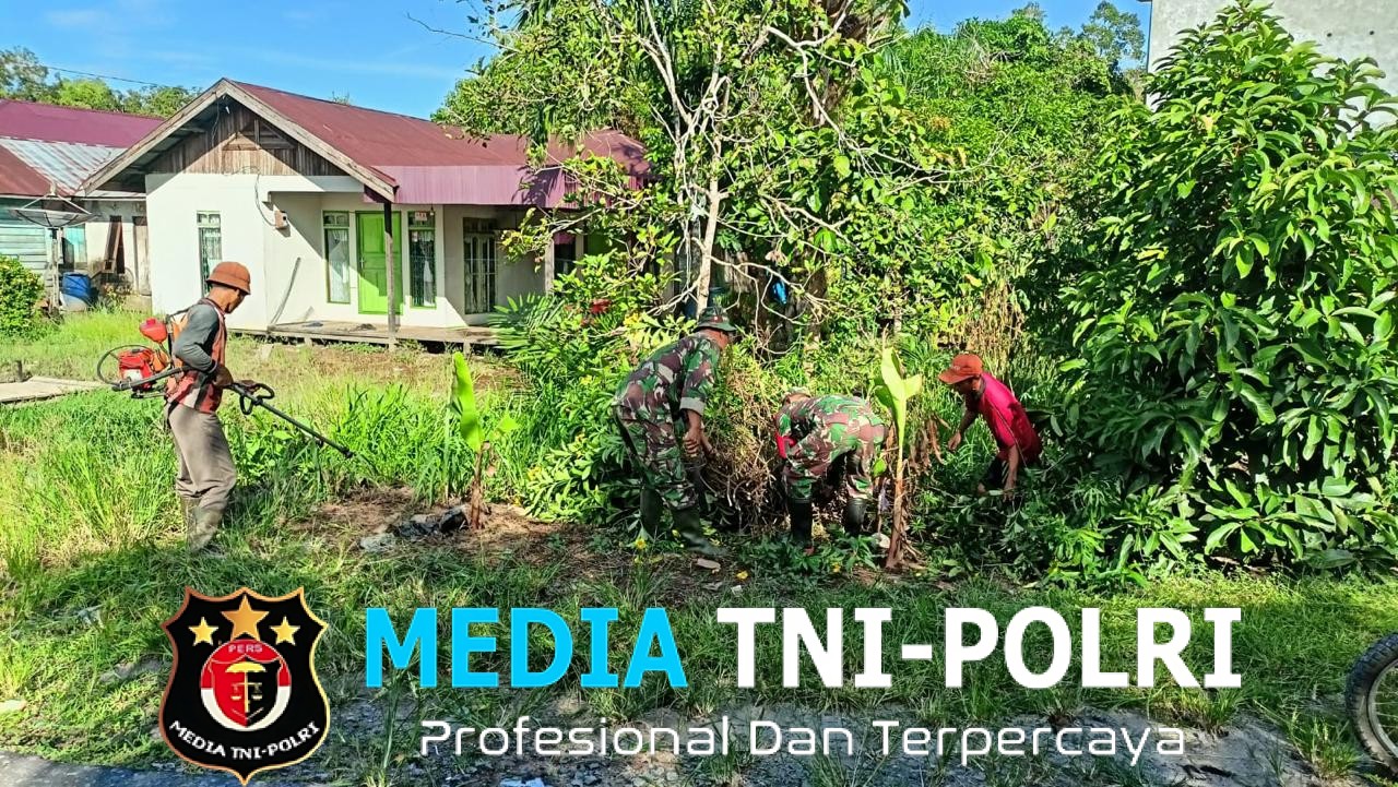 KOTAWARINGIN TIMUR // MEDIATNI-POLRI.COM / Babinsa Koramil 1015-02/Mentaya Hilir Utara Sertu Poniman bersama Bhabinkamtibmas Polsek Bagendang melaksanakan gotong royong membersihkan semak belukar dan membersihkan parit di Desa Bagendang Tengah, Kecamatan Mentaya Hilir Utara, Kabupaten Kotawaringin Timur, Minggu (23/11/2025)
