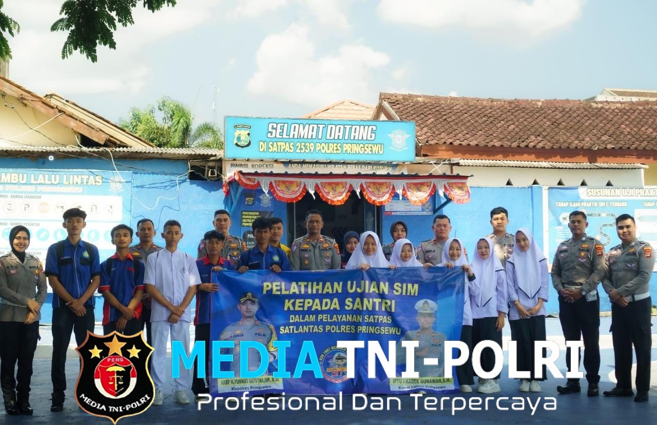 PRINGSEWU // MEDIATNI-POLRI.COM / Sejumlah santri dari SMKS Nurul Huda Pringsewu tampak antusias mengikuti pelatihan mekanisme pembuatan Surat Izin Mengemudi (SIM) di kantor Satpas Polres Pringsewu, Kelurahan Pringsewu Barat, Senin (8/9/2025).