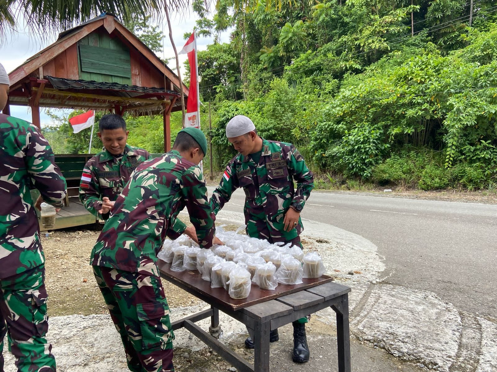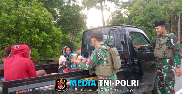 KEEROM // MEDIATNI-POLRI.COM / Di bulan Ramadhan penuh berkah ini, Satgas Yonif 131/BRS Pos Muara Tami membagikan paket takjil bagi pengguna Jalan Lintas Skow, Distrik Muara Tami dalam rangka saling berbagi di bulan penuh berkah, Sabtu (15/03/2025).