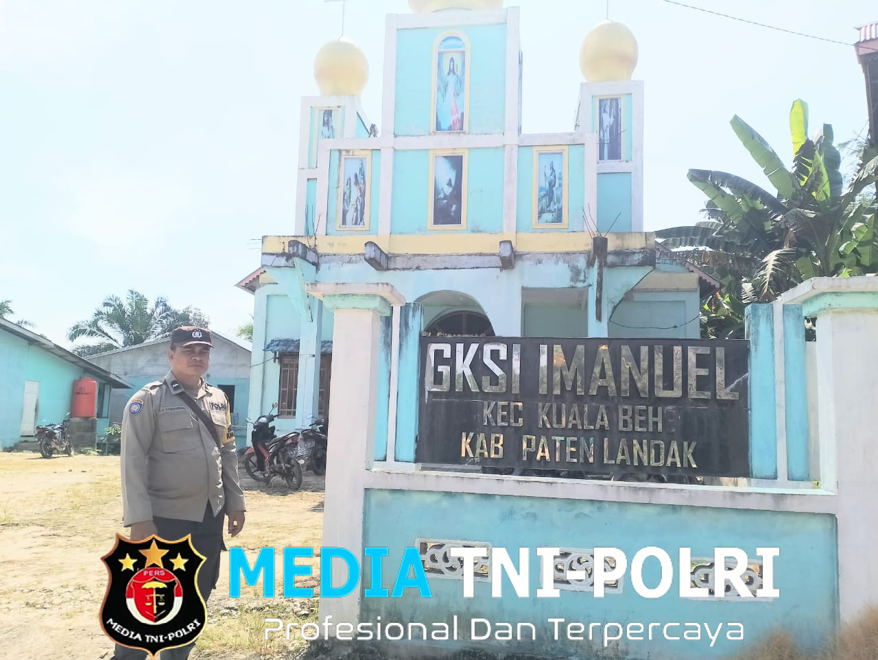 LANDAK // MEDIATNI-POLRI.COM / Polsek Kuala Behe – Polres Landak, Kegiatan Babinkamtibmas Polsek Kuala Behe Aipda Heri Chandra Simatupang laksanakan kegiatan rutin yaitu pengamanan di ibadah hari minggu gereja di Kecamatan Kuala Behe, Minggu (11/05/2025).