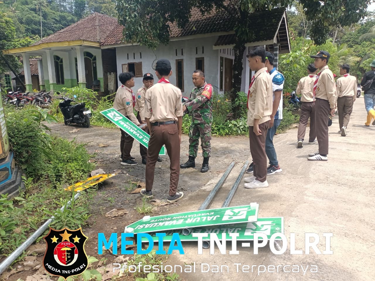 AMPELGADING // MEDIATNI-POLRI.COM / Semangat gotong royong kembali terasa di Desa Lebakharjo. BPBD Kabupaten Malang bersama warga dan adik-adik Pramuka dari SMK 1 PGRI Ampelgading bergandeng tangan memasang rambu-rambu tanda bencana serta jalur evakuasi, Desa Lebakharjo, Kecamatan Ampelgading, Kabupaten Malang, (27/10/2025).