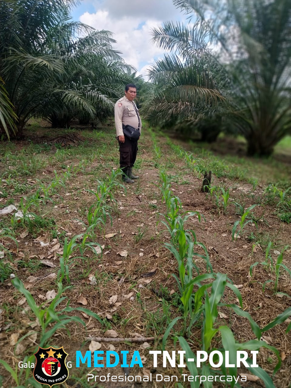 Bripka Heryanto bersama Kelompok Tani (Poktan) LELAMOK RAYA yang diketuai oleh Bapak Lagam, terlihat meninjau langsung lahan pertanian warga yang ditanami jagung di sela-sela kebun kelapa sawit.