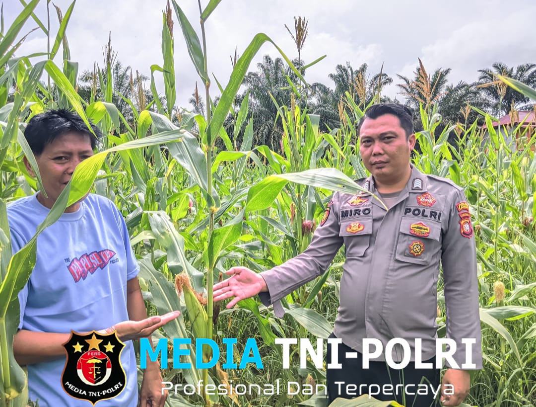 LANDAK // MEDIATNI-POLRI.COM / Bintara Pengerak Ketahanan Pangan Desa Ansang Kecamatan Menyuke Kabupaten Landak Bripka Adrianus Vivi Miro melakukan pengecekan perkembangan pertumbuhan tanaman jagung kelompok tani sumber alam sejahtera.