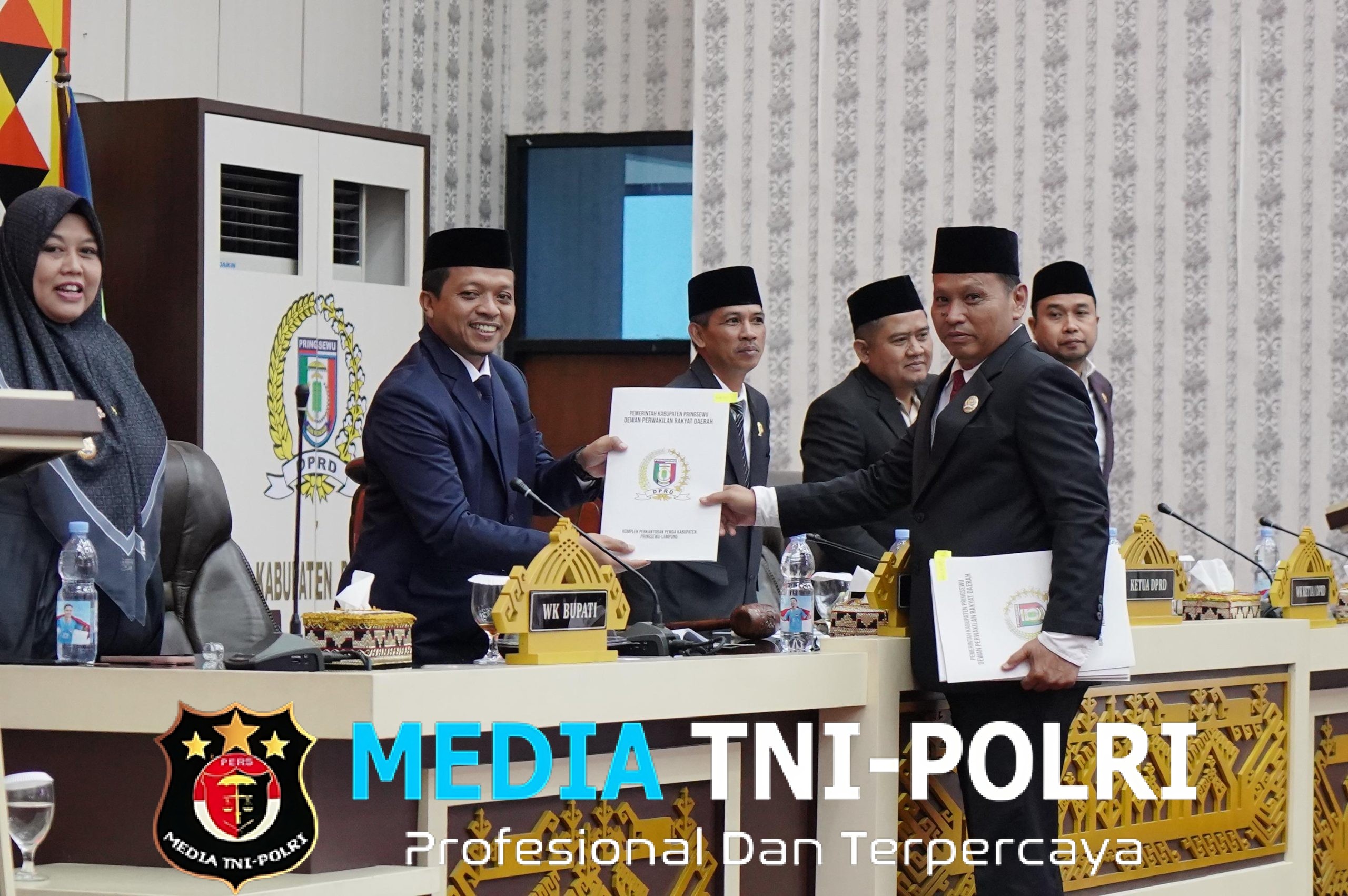PRINGSEWU // MEDIATNI-POLRI.COM / Bupati Pringsewu Riyanto Pamungkas dan pimpinan DPRD Pringsewu menandatangani nota kesepakatan dan berita acara terkait Kebijakan Umum Anggaran dan Prioritas Platform Anggaran Sementara (KUA-PPAS) 2026 dan Perubahan KUA-PPAS 2025 pada rapat paripurna DPRD setempat, Jumat (15/08/2025).