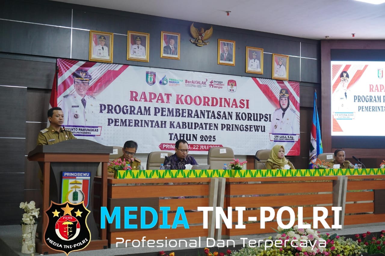 PRINGSEWU // MEDIATNI-POLRI.COM / Bupati Pringsewu H. Riyanto Pamungkas menghadiri sekaligus membuka secara resmi Rapat Koordinasi Program Pemberantasan Korupsi Pemerintah Kabupaten Pringsewu Tahun 2025, yang dilaksanakan di Aula Utama Kantor Bupati Pringsewu, Selasa (22/07/2025).