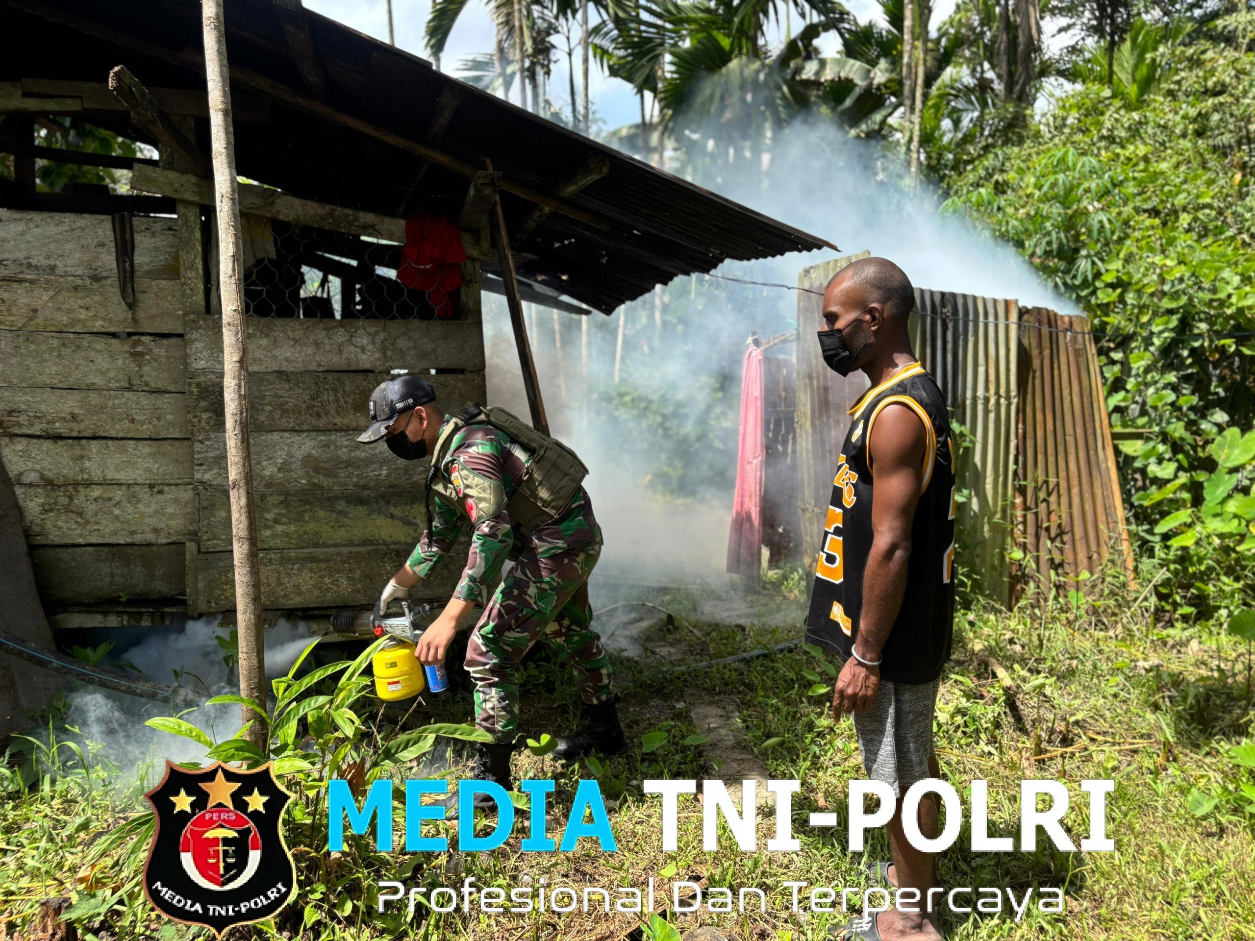 Dipimpin oleh Serda Andika, para personel Satgas melaksanakan kegiatan fogging atau pengasapan nyamuk di kawasan perumahan warga.