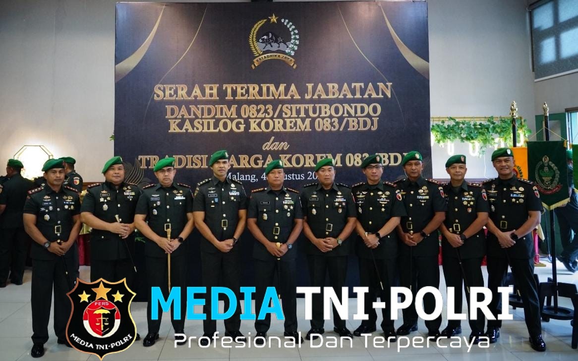 MALANG // MEDIATNI-POLRI.COM / 4 Agustus 2025 – Komandan Korem 083/Baladhika Jaya Kolonel Inf Kohir memimpin langsung prosesi Serah Terima Jabatan (Sertijab) Komandan Kodim 0823/Situbondo dan Kepala Seksi Logistik Korem 083/Bdj, bertempat di Aula Untung Suropati Makorem 083/Bdj, Jl. Bromo No. 17, Kota Malang, Senin (4/8/2025).