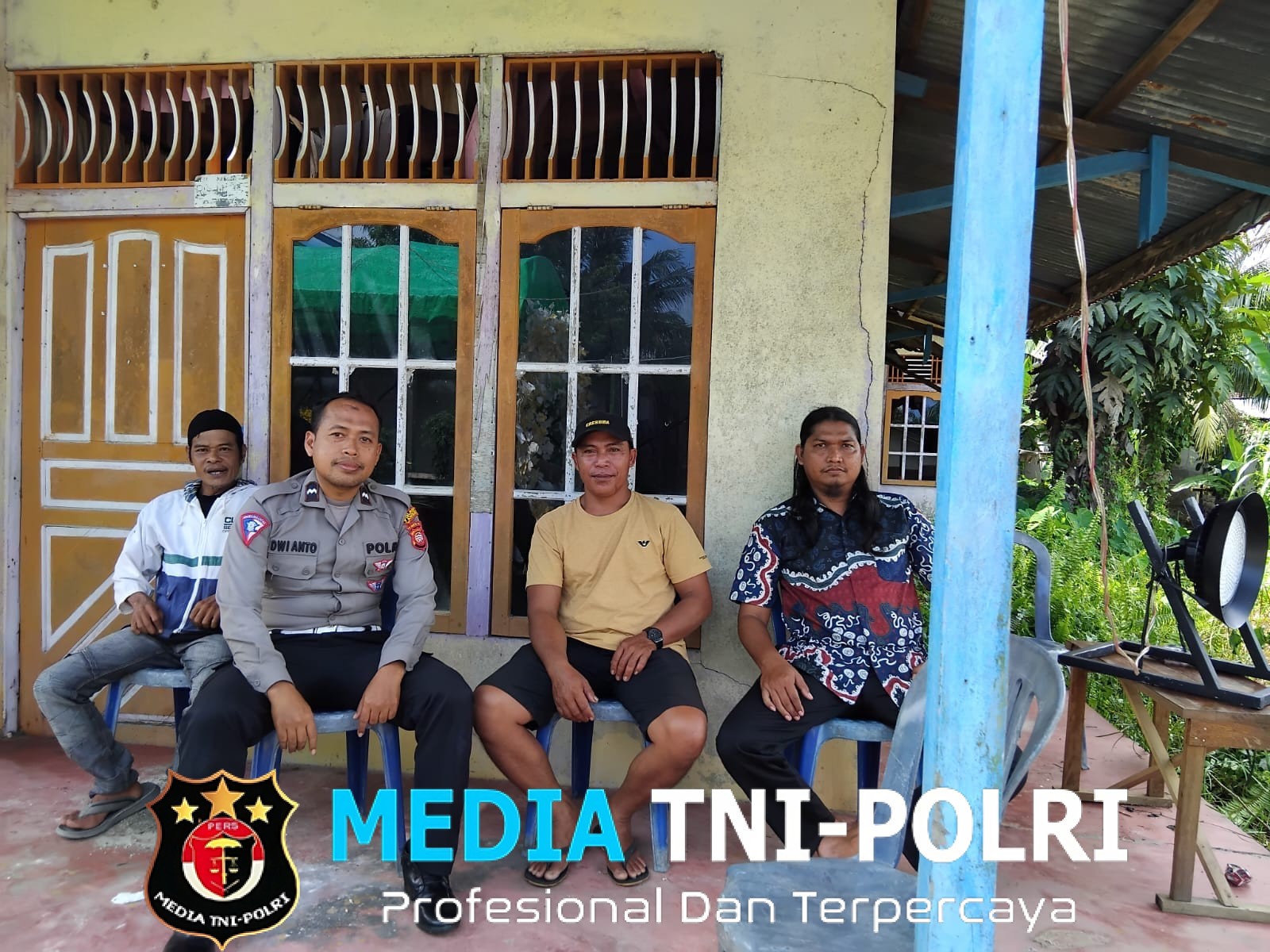 Suasana penuh keakraban terlihat ketika polisi duduk bersama masyarakat di teras rumah warga.