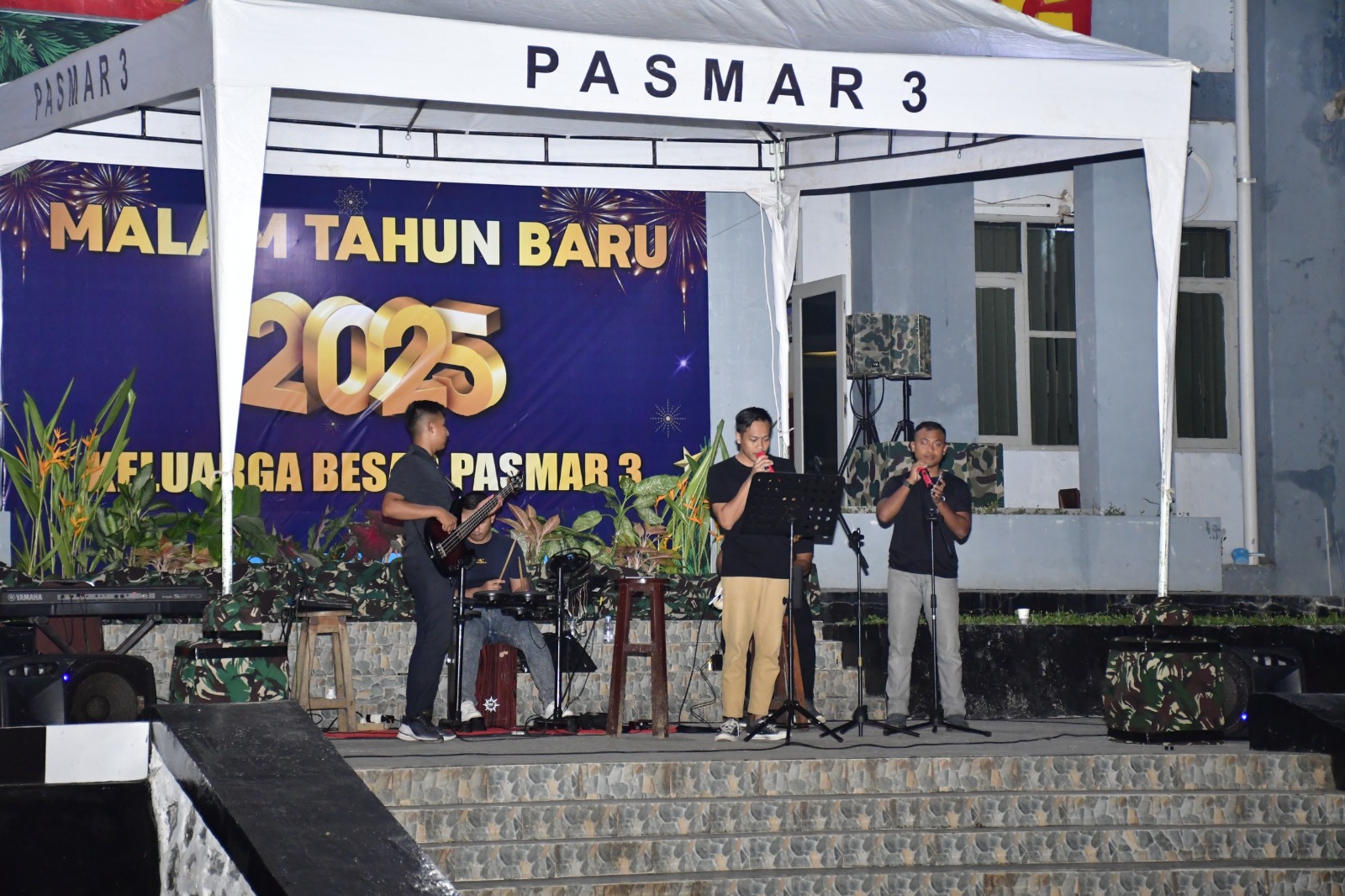 KOTA SORONG // MEDIATNI-POLRI.COM / Meriahkan acara puncak perayaan Malam Pergantian tahun baru 2025, D’Markaz Band Pasmar 3 hadir menghibur seluruh para prajurit petarung Pasmar 3 bertempat di belakang Mako Pasmar 3, Kesatrian Agoes Soebekti, Jl. Sorong-Klamono, Km.16, Distrik Klaurung, Kota Sorong, Papua Barat Daya. Selasa (31/12/2024).