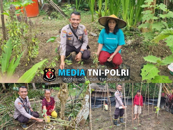 Bripka F. Rony selaku Bhabinkamtibmas meninjau langsung kebun yang ditanami berbagai jenis sayuran dan tanaman pangan bergizi.