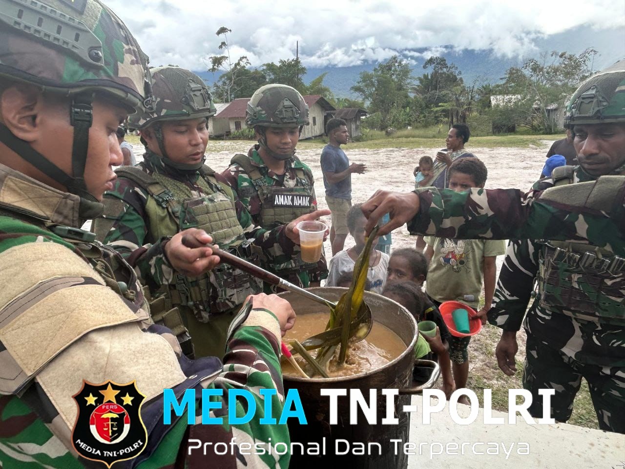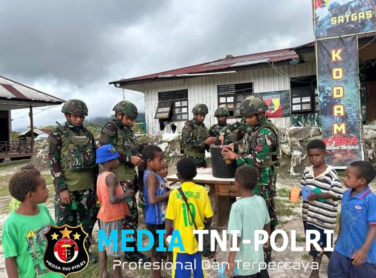 YALIMO // MEDIATNI-POLRI.COM / Kegiatan sosial dan kemanusiaan Satuan Tugas (Satgas) TNI di lapangan untuk menyediakan makanan tambahan bergizi bagi masyarakat setempat, terutama anak-anak dan ibu hamil, dalam rangka pencegahan stunting dan peningkatan gizi masyarakat di Distrik Apalapsili, Yalimo, Papua Pegunungan (07/11/2025).