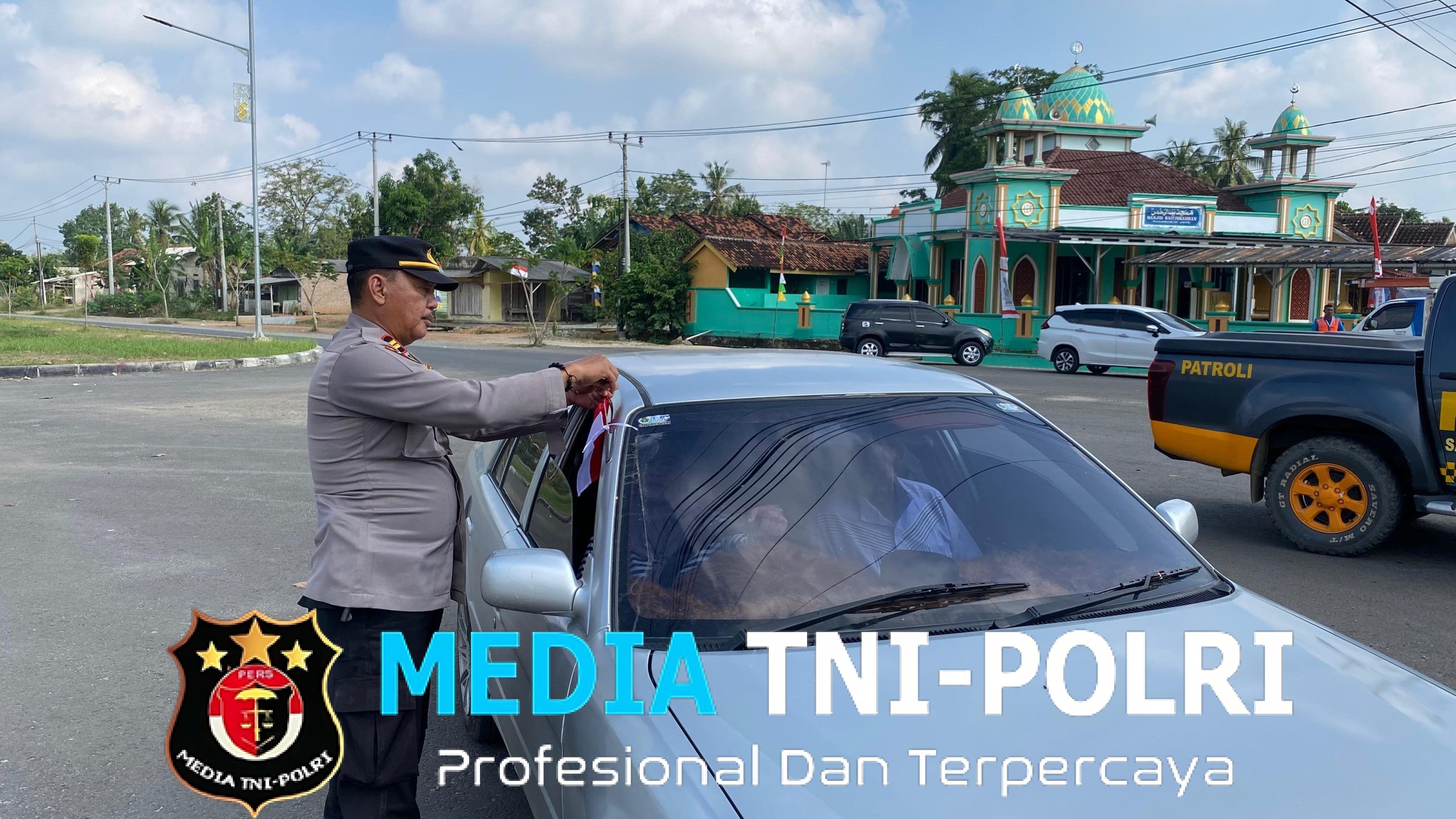 Dengan senyum ramah dan humanis, Kasat Intelkam bersama jajarannya memasangkan Bendera Merah Putih di kendaraan masyarakat yang melintas.