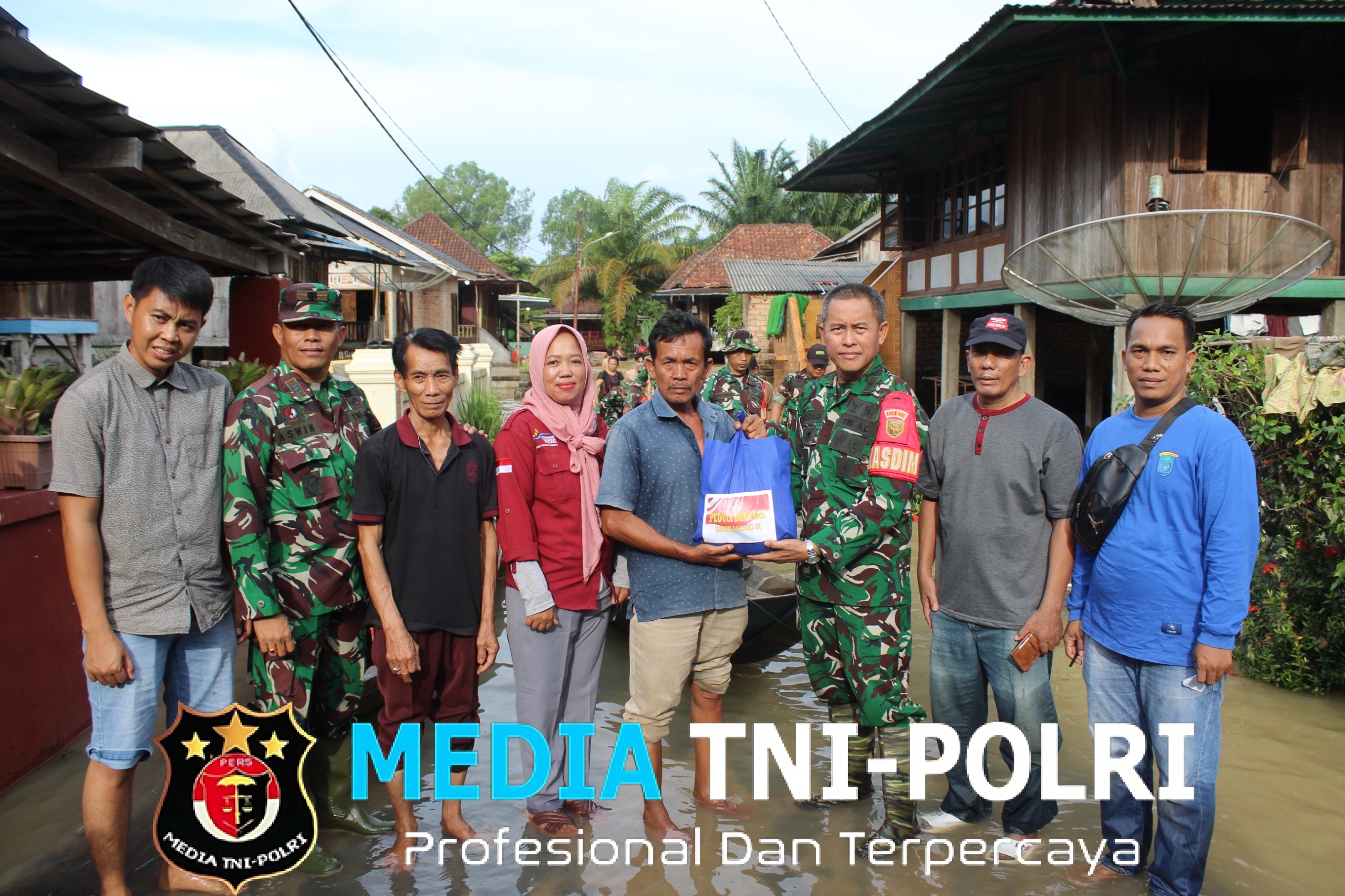 Dandim 0402/OKI, Letkol Inf Gunawan Wibisono. S.H., secara langsung memberikan bantuan sembako juga melihat kondisi terkini bencana banjir tersebut.