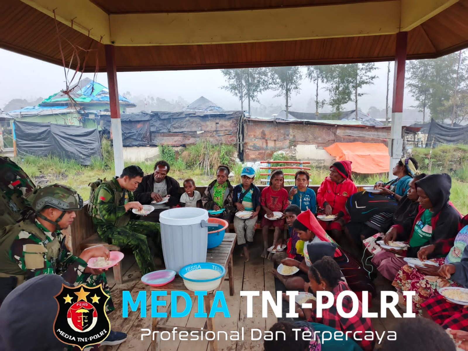 DISTRIK OMUKIA // MEDIATNI-POLRI.COM / Kebersamaan yang terjalin antara Prajurit Satgas Yonif 700/Wira Yudha Cakti dan warga Kampung Eronggobak tak berhenti di ruang ibadah. Meskipun hujan deras mengguyur,
