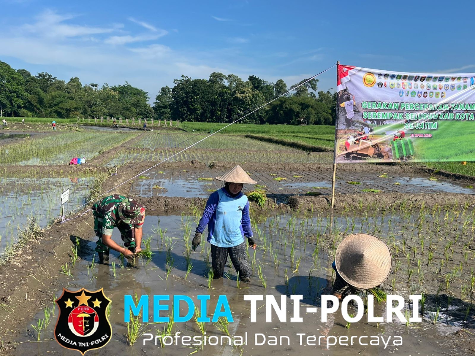 BLITAR // MEDIATNI-POLRI.COM / Dalam upaya memperkuat ketahanan dan swasembada pangan nasional, Babinsa Desa Butun Koramil 0808/15 Gandusari Kopka Yoko S terjun langsung membantu petani dalam kegiatan tanam padi serentak se-Jawa Timur.