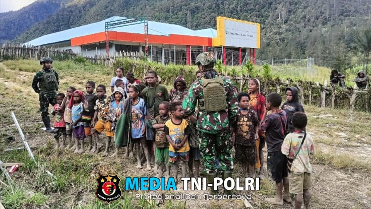 ILAGA UTARA // MEDIATNI-POLRI.COM / Suasana penuh keceriaan dan kehangatan tampak di halaman Kampung Mayuberi, Distrik Ilaga Utara, Kaplb Puncak saat Pos Mayuberi Satgas Yonif 700/WYC di bawah pimpinan Letnan Dua Infanteri Arif Natsir melaksanakan kegiatan komunikasi sosial (komsos) bersama puluhan anak-anak dari kampung tersebut. (11/04/2025)