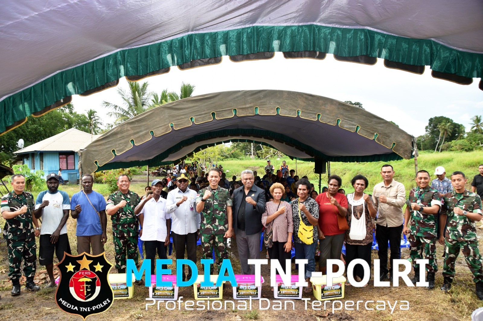 Nampak hadir para pejabat Kodam XXIV/Mandala Trikora, Danrem 174/ATW Brigjen TNI Mustakim, S.I.P., M.Si., Kasi Keterpaduan Pembangunan BWS Papu Selatan Quentino Elgar dan Kepala Kampung Chandra Jaya Bapak Aris.