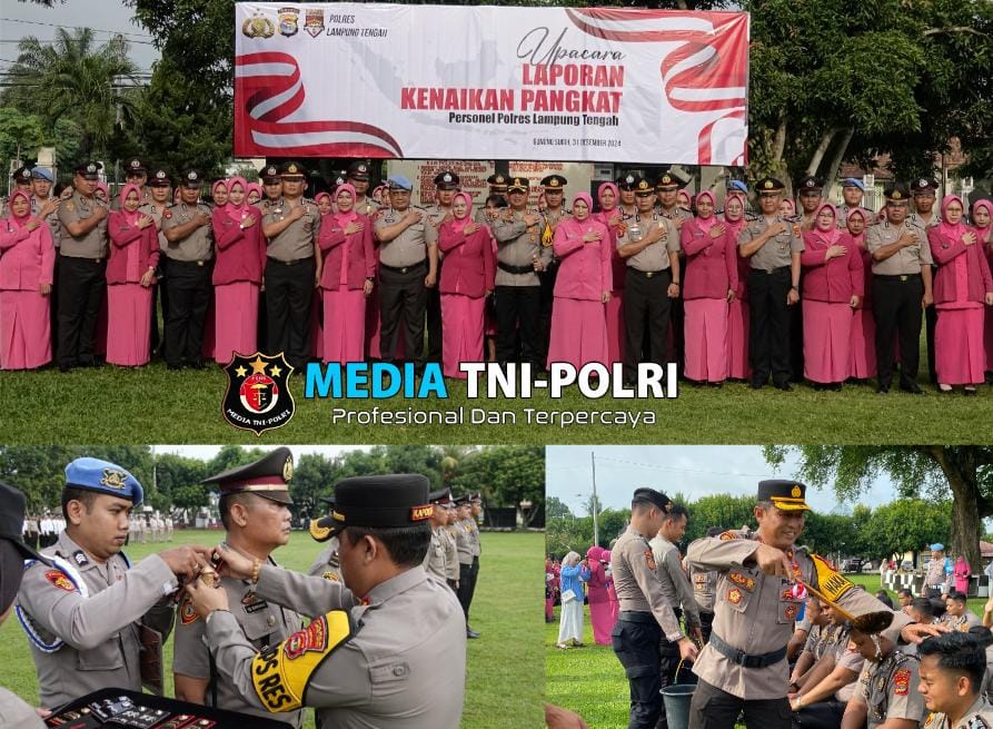 LAMPUNG TENGAH // MEDIATNI-POLRI.COM / Kapolres Lampung Tengah, Polda Lampung AKBP Andik Purnomo Sigit, S.H., S.I.K., M.M memimpin langsung upacara Korp Raport kenaikan pangkat perwira dan bintara Personel Polres Lampung Tengah, di lapangan apel Mapolres setempat, Selasa (31/12/2024) pagi.