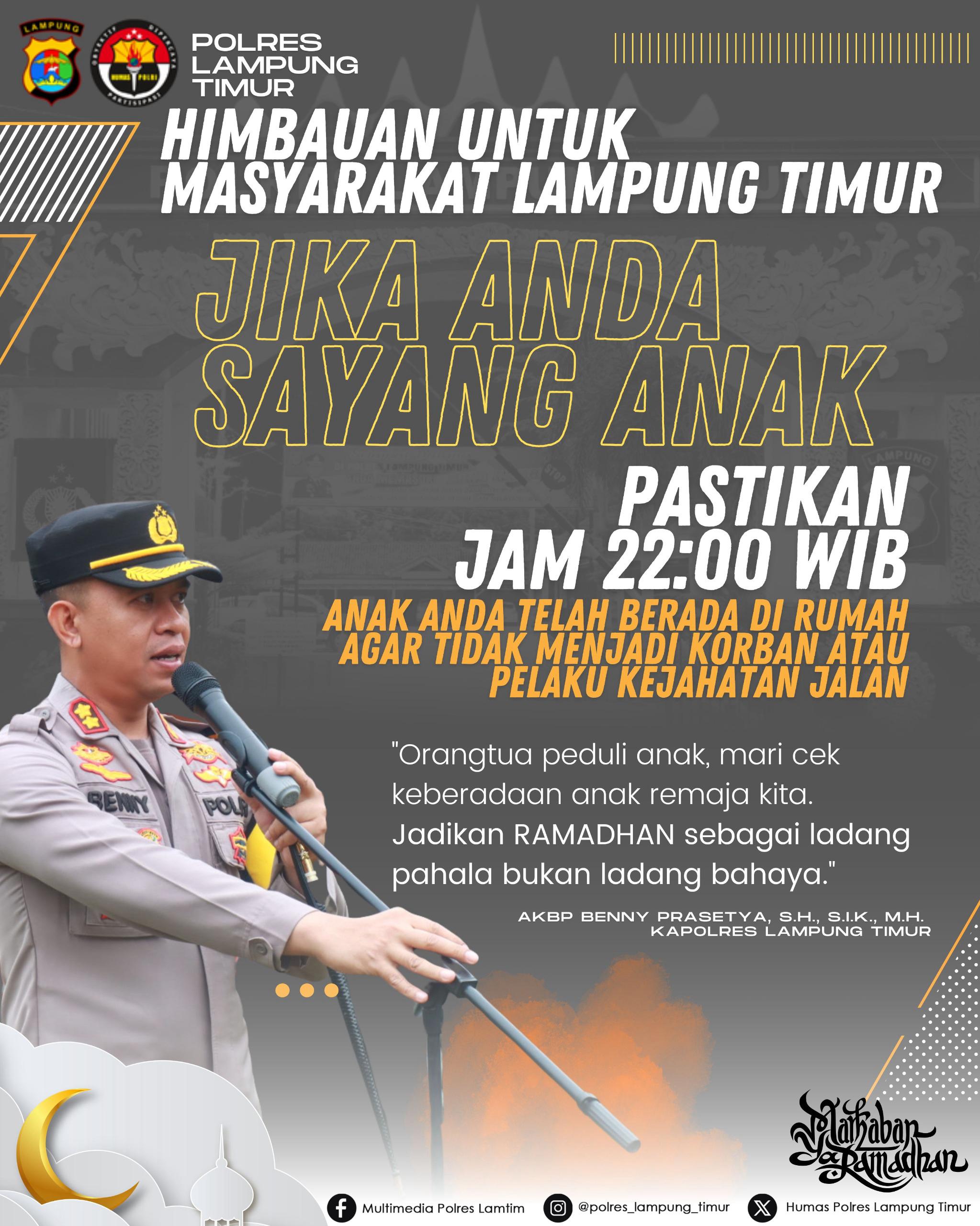 LAMPUNG TIMUR // MEDIATNI-POLRI.COM / Kapolres Lampung Timur, AKBP Benny Prasetya, mengimbau kepada seluruh masyarakat, terutama para orang tua,