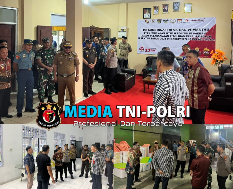 LAMPUNG UTARA // MEDIATNI-POLRI.COM / Kapolres Lampung Utara AKBP Deddy Kurniawan bersama Forkopimda Flus Kabupaten setempat memantau Tim Desk Pelaksanaan Pilkada Serentak 2024, Jumat (22/11/2024).