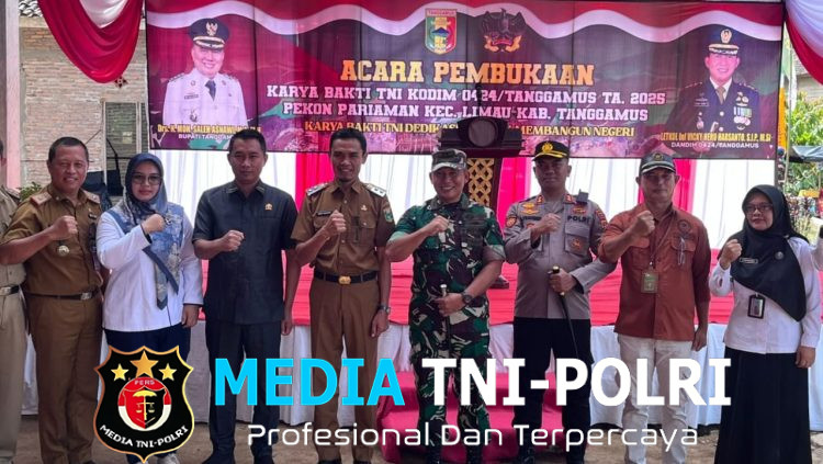 TANGGAMUS // MEDIATNI-POLRI.COM / Kapolres Tanggamus, AKBP Rahmad Sujatmiko, S.I.K., M.H., menghadiri kegiatan pembukaan Karya Bakti TNI Kodim 0424 Tanggamus Tahun 2025 yang berlangsung di Pekon Pariaman, Kecamatan Limau, Kabupaten Tanggamus, Senin (19/5/2025).