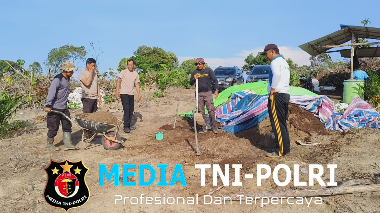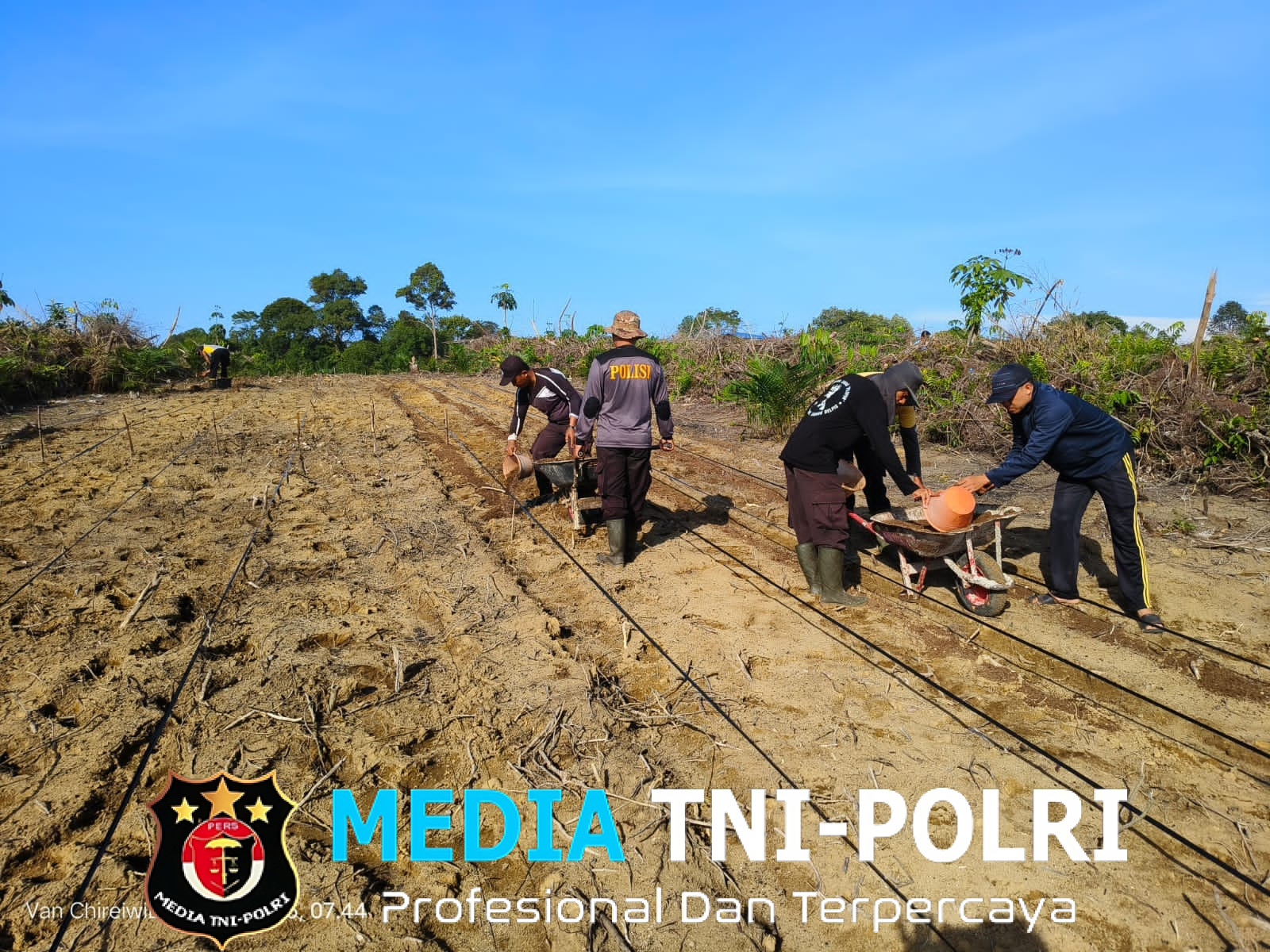 LANDAK // MEDIATNI-POLRI.COM / Polsek Mandor~ Polres Landak ~ Polda Kalbar ~Kapolsek Mandor IPTU Yulianus Van Chanel. TK, S.I.P bersama anggota dan masyarakat Desa Pongok melaksanakan kegiatan gotong royong pembersihan lahan, pemasangan tali jalur tanam,