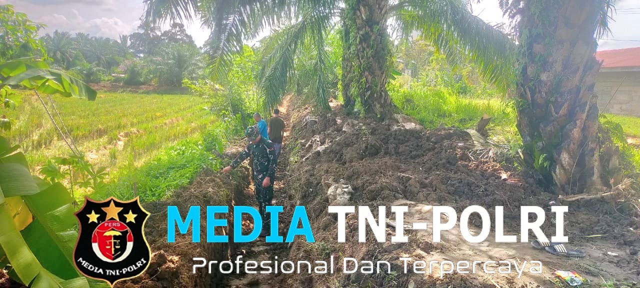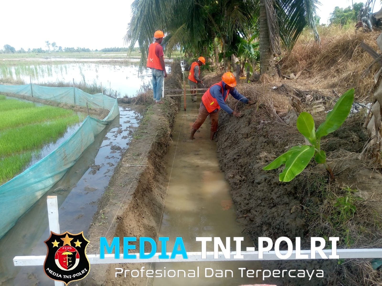 Para personel TNI bersama masyarakat bahu membahu melaksanakan pekerjaan penggalian saluran serta pemasangan bouplang untuk memperlancar aliran air ke lahan pertanian warga.