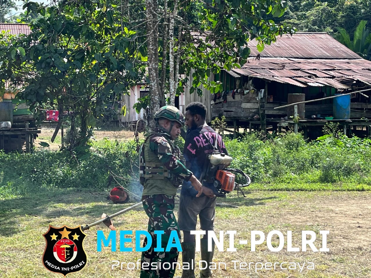 JAYAPURA // MEDIATNI-POLRI.COM / Dalam rangka menjaga kondisi lingkungan supaya selalu terlihat bersih dan rapi, Satgas kewilayahan Pamtas RI-PNG Yonif 521/DY Pos Muaranawa bersama masyarakat menggelar kerja bakti membersihkan jalan utama Kampung Muaranawa Distrik Airu, Kabupaten Jayapura, Papua. (10 Agustus 2025).