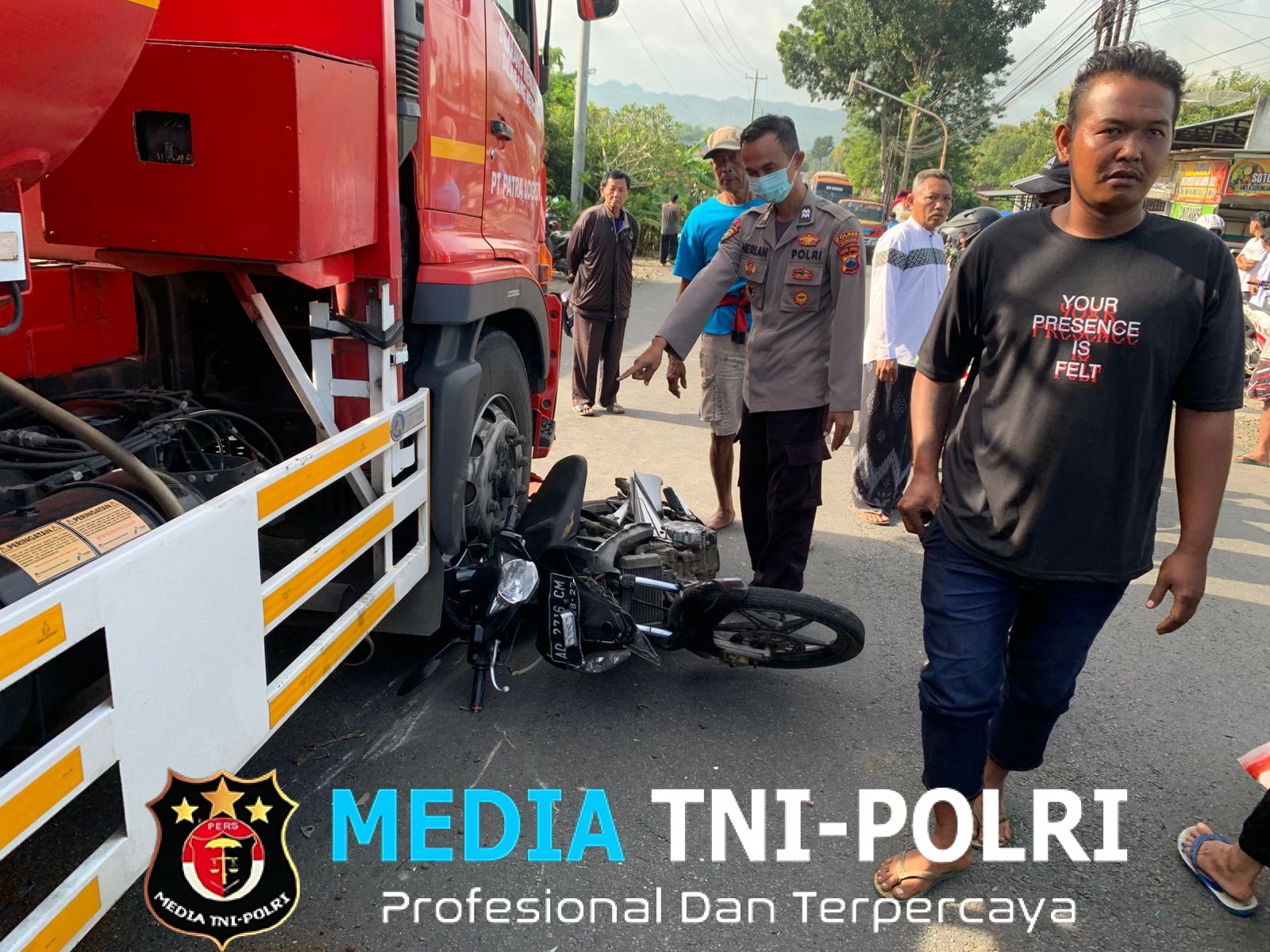 Pada saat bersamaan, dari arah utara melaju truk tangki BBM yang berada di belakang sepeda motor Yamaha Mio.