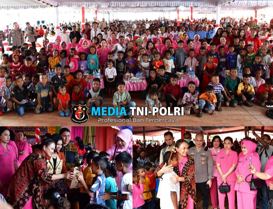 FOLRES TIMUR NTT // MEDIATNI-POLRI.COM / Ketua Umum Bhayangkari Pusat, Juliati Sigit Prabowo, merayakan Natal bersama para korban erupsi Gunung Lewotobi di Desa Kobasoma, Kecamatan Titehena, Kabupaten Flores Timur, Nusa Tenggara Timur (NTT), Sabtu (28/12/2024).