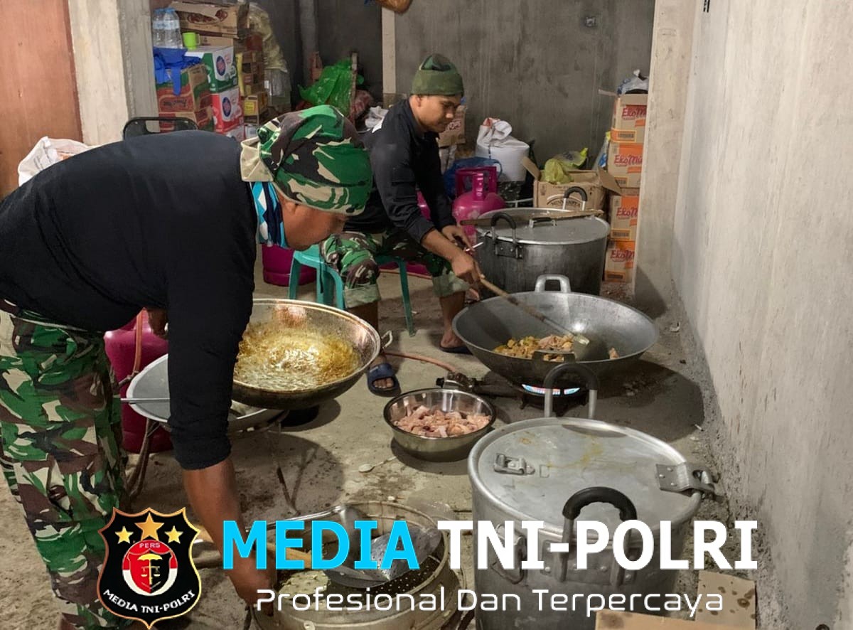 Sejumlah prajurit terlihat menyiapkan makanan menggunakan peralatan sederhana guna memastikan distribusi makanan tetap lancar bagi masyarakat yang kesulitan akses.