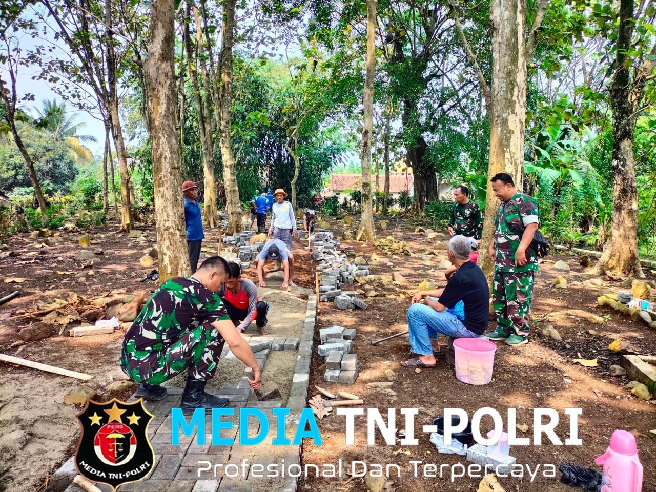 PANDEGLANG // MEDIATNI-POLRI.COM / Koramil 0104/Cimanuk Kodim 0601/Pdg melaksanakan kegiatan Kerja Bakti pemasangan paving block untuk jalan sepanjang 100 meter pada hari Selasa (12/08/2025) bertempat di TPU Cihideung Barat Desa Batubantar Kec. Cimanuk Kab. Pandeglang.