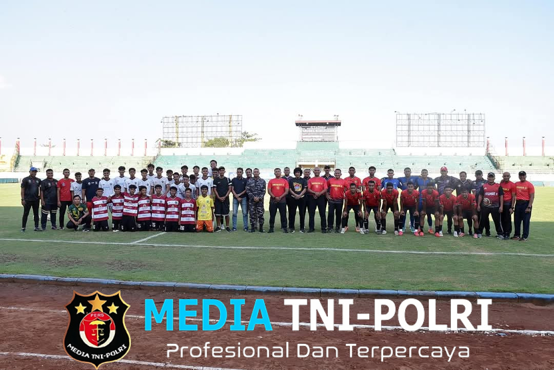 BANGKALAN // MEDIATNI-POLRI.COM / Komandan Pasmar 2 Brigjen TNI (Mar) Nanang Saefulloh, S.E., M.M., menyaksikan secara langsung laga uji coba Kesebelasan Marwiltim berhadapan dengan Kesebelasan Porprov Bangkalan di Stadion Gelora Bangkalan, Madura. Selasa (29/04/2025).