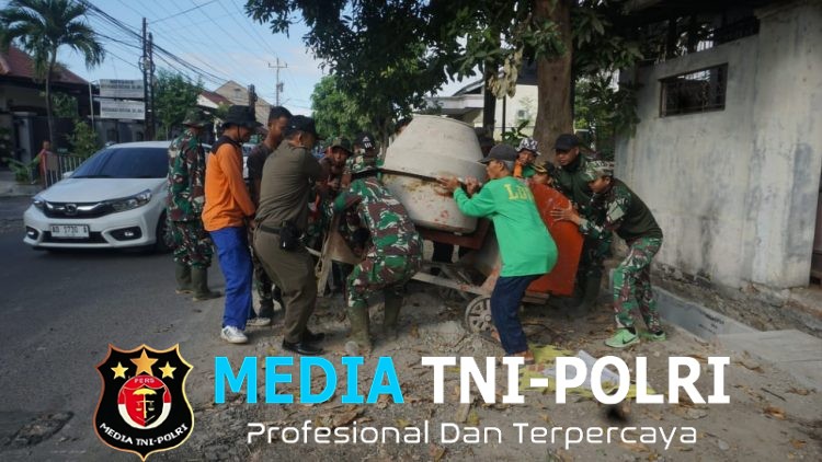 SURAKARTA // MEDIATNI-POLRI.COM / Sejumlah prajurit TNI Satgas TMMD Reguler ke-125 Kodim 0735/Surakarta tampak sangat kompak dengan warga masyarakat dalam memindahkan mesin molen,