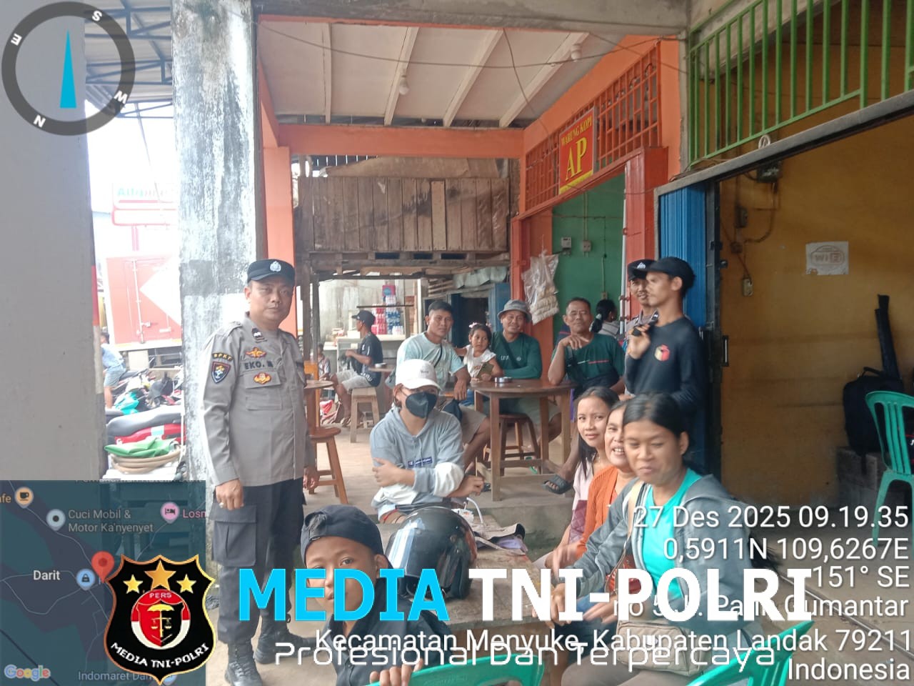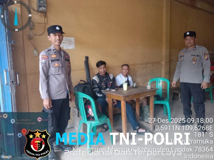LANDAK // MEDIATNI-POLRI.COM / Melaksanakan tugas Patroli Samapta Polsek Menyuke Berikan Imbauan keamanan dan ketertiban masyarakat kepada warga masyarakat yang lagi santai di Desa Darit, Sabtu (27/12/2025) Siang.