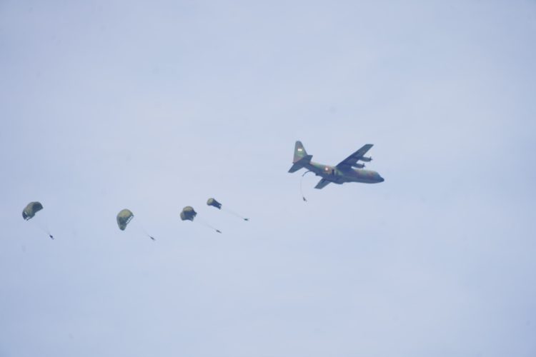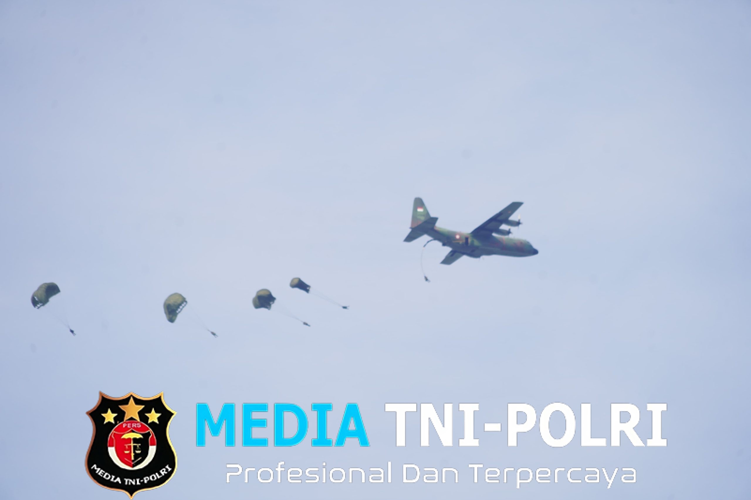 Ratusan prajurit berkualifikasi Para membuktikan kapabilitasnya dalam tiga gelombang penerjunan menggunakan pesawat C-130/Hercules milik TNI AU. Jombang (17/7/2025).