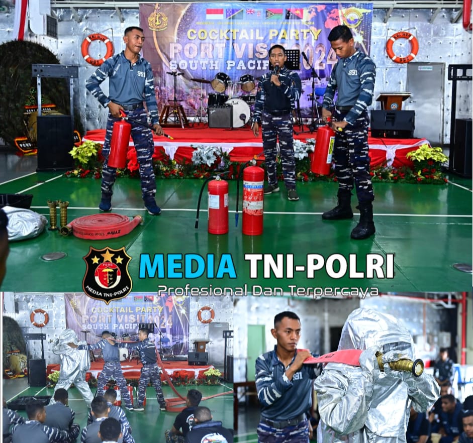 PAPUA NEW GUINEA // MEDIATNI-POLRI.COM / Satuan Tugas (Satgas) Port Visit 2024 saat melintas di perairan Papua New Guinea menuju etape pertamanya Negara Solomon Islands, memberikan pembekalan materi peran penyelamatan kapal kebakaran