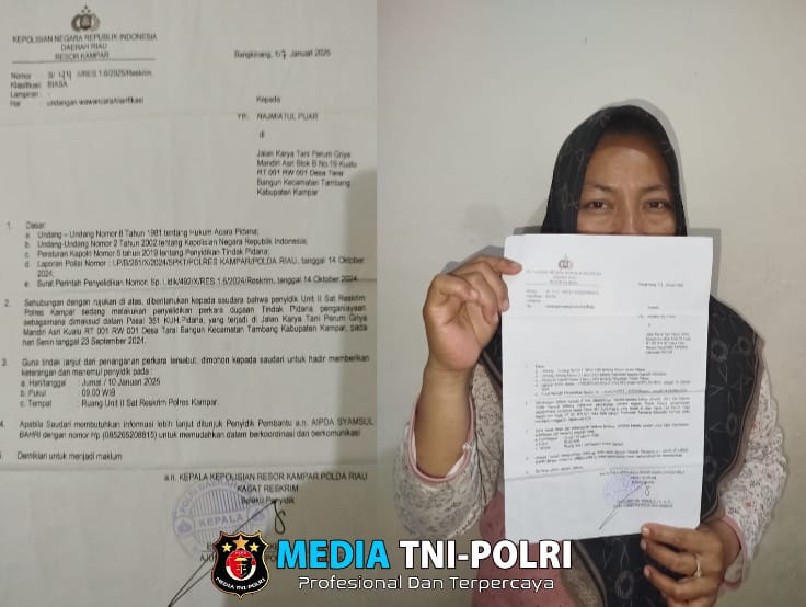 PEKANBARU // MEDIATNI-POLRI.COM / Najmiatul Pijar seorang ibu rumah tangga berumur 38 tahun, harus menjalani proses Penyelidikan dan Penyidikan sebagai Terlapor yang terkait dugaan tidak pidana di Polres Kampar dalam peristiwa pengeroyokan terhadap dirinya yang terjadi pada 23 September 2024.