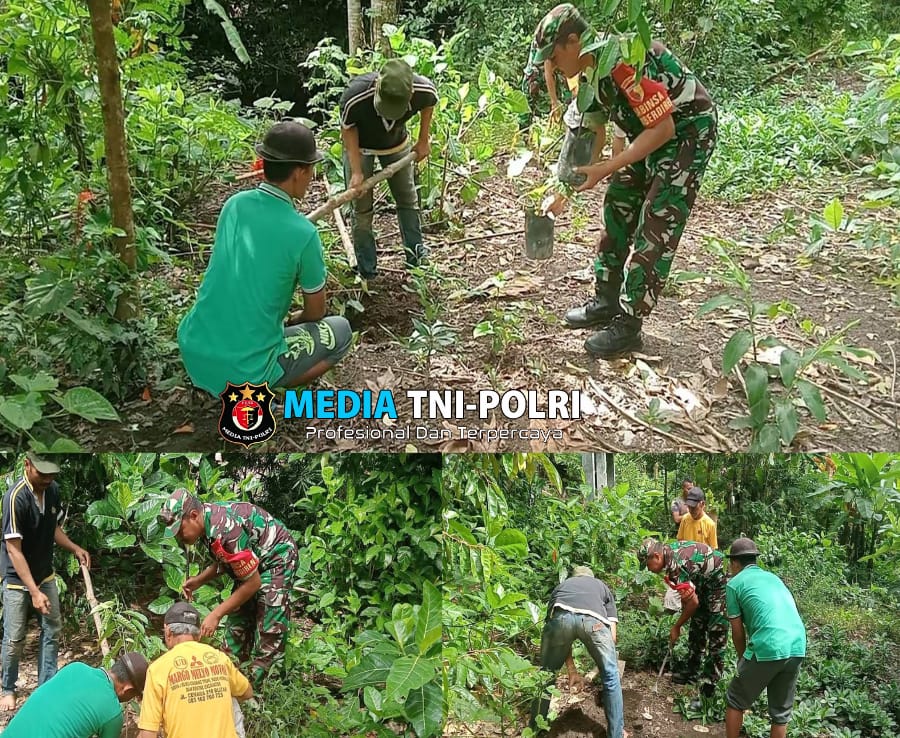 Babinsa Kelurahan Sumberdiren Koramil 0808/02 Garum Kodim 0808/Blitar Serda Agus H bersama warga setempat melakukan kegiatan penanaman pohon keras jenis trembesi, sukun dan mahoni bertempat di Lingk. Sumberdiren Kel. Sumberdiren Kec. Garum Kab. Blitar, Rabu (1/1/2025).