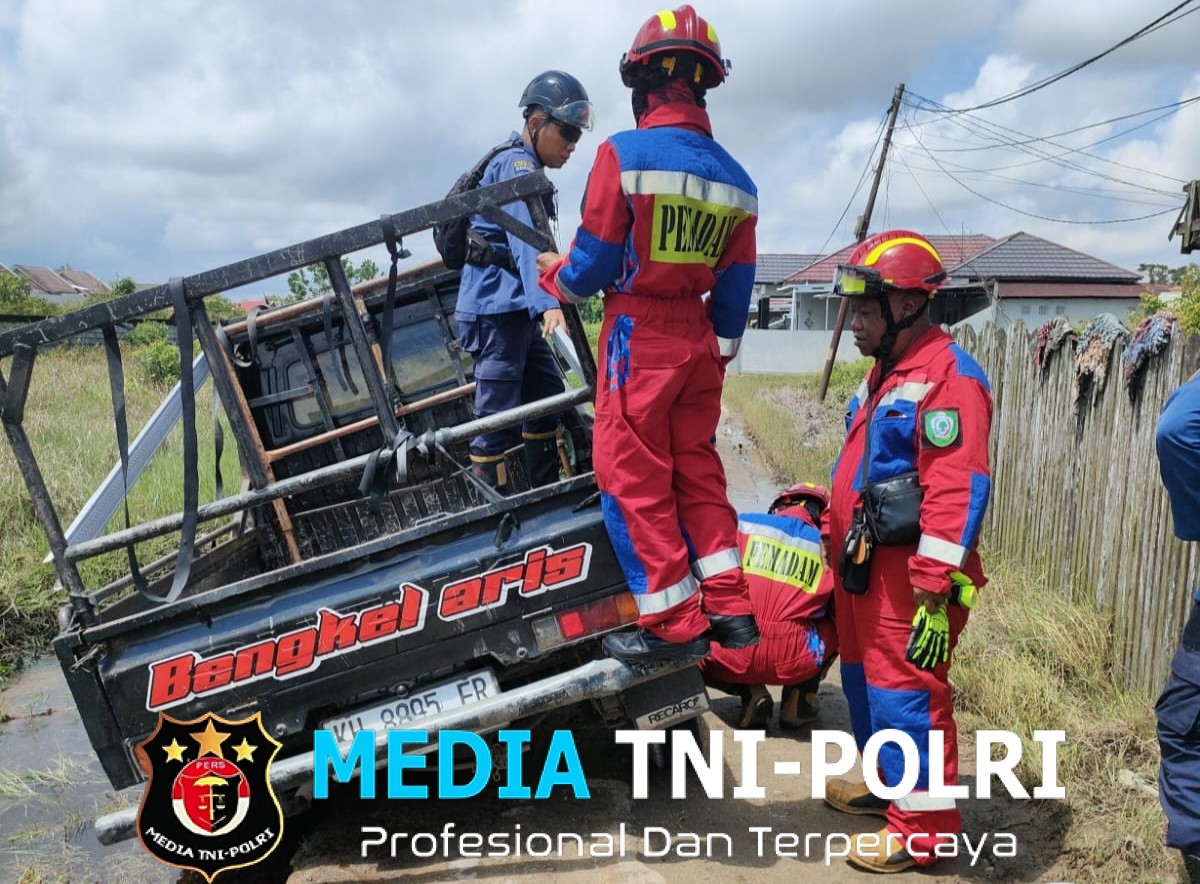 KOTIM // MEDIATNI-POLRI.COM / Sebuah mobil pikap yang terperosok ke dalam parit di Jalan Walter Condrat, Gang Swadaya Murai, Kelurahan Baamang Tengah,