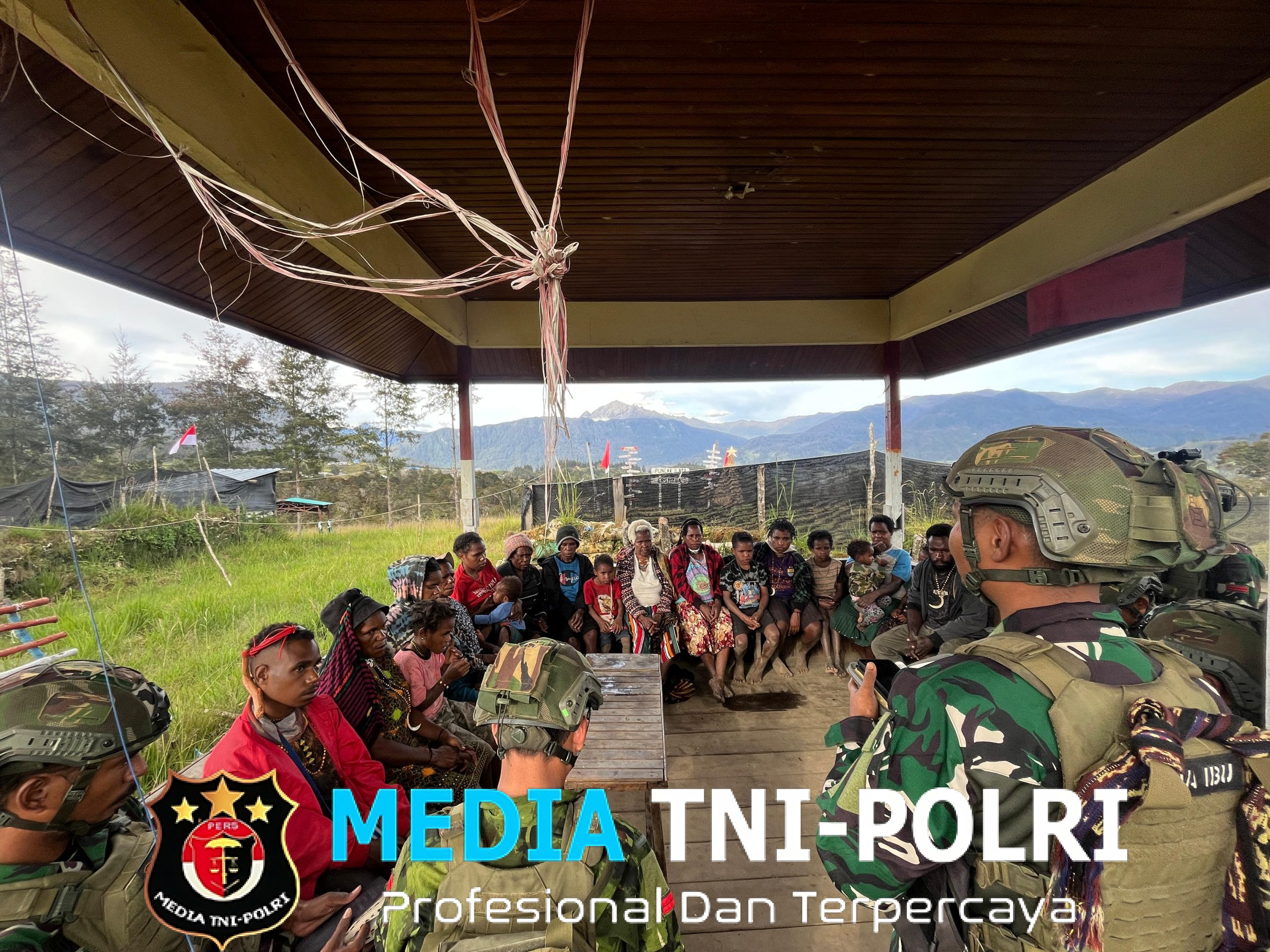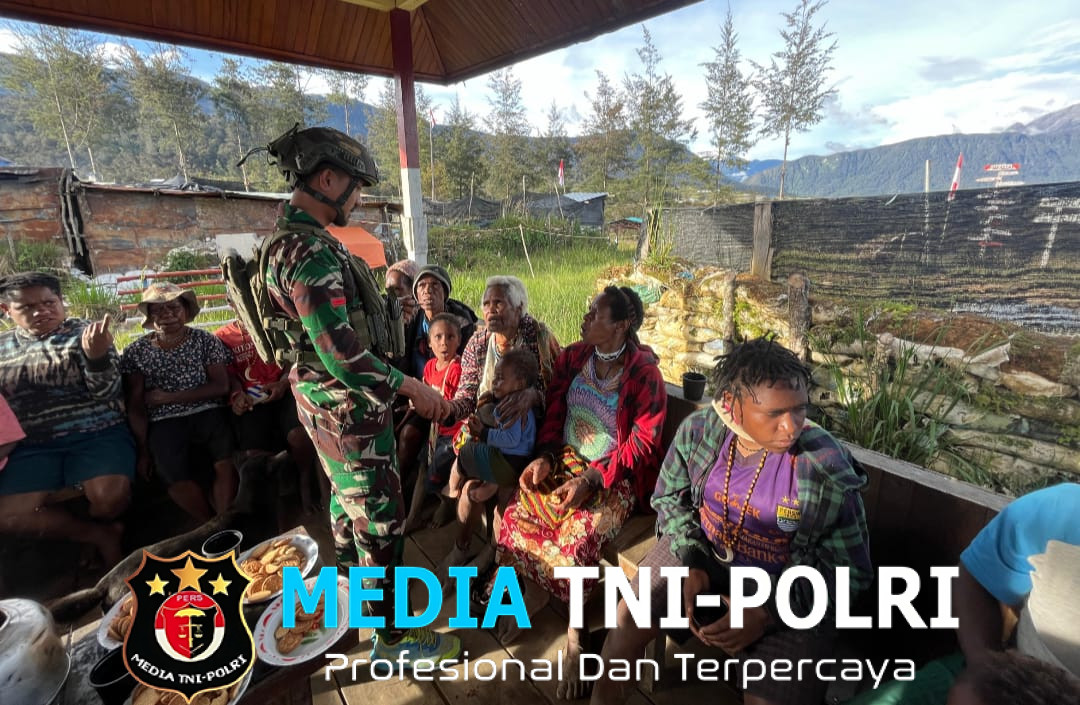Dalam dokumentasi yang beredar, tampak prajurit TNI dengan seragam loreng berbaur hangat dengan warga, termasuk anak-anak dan para ibu.