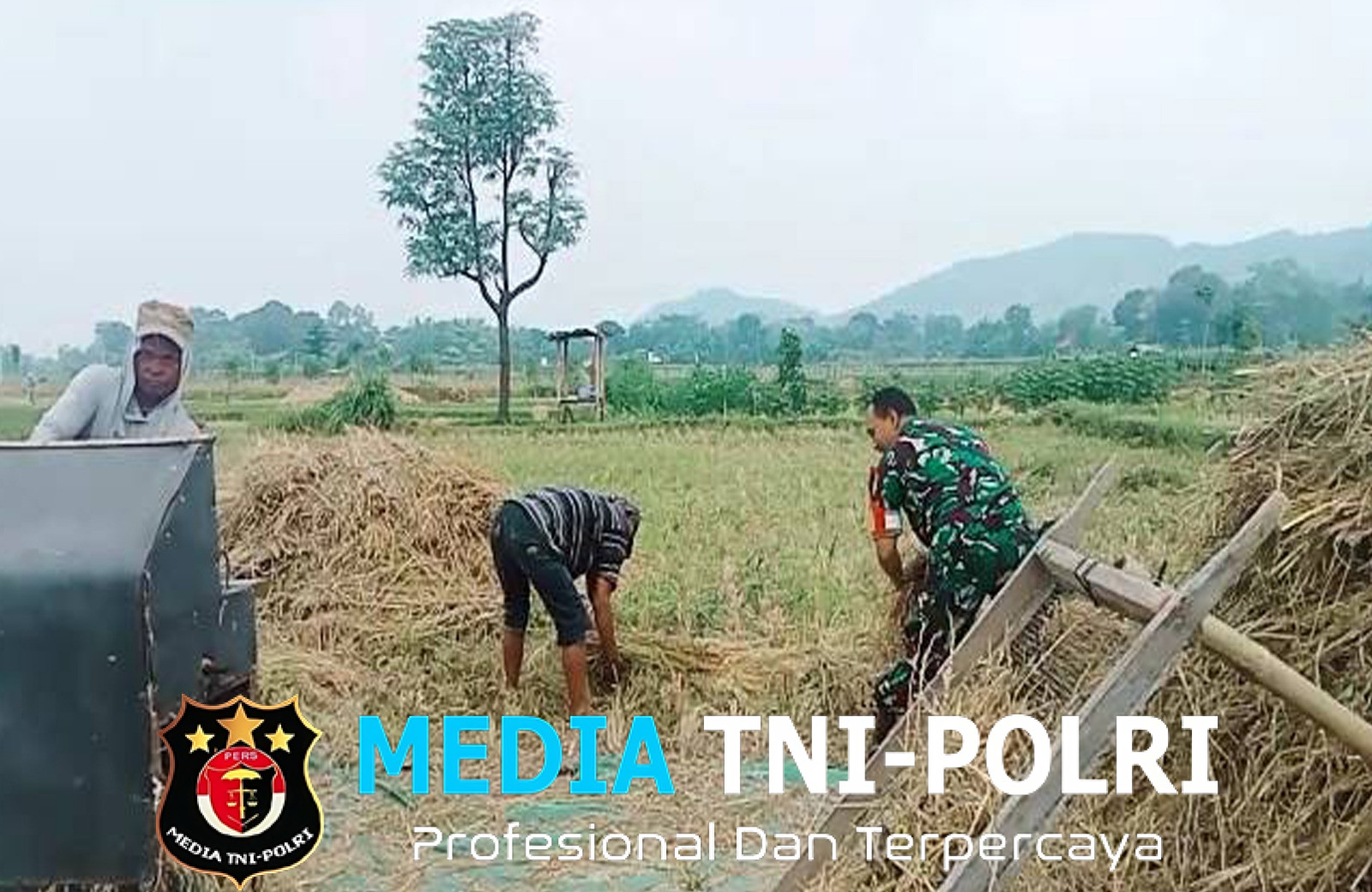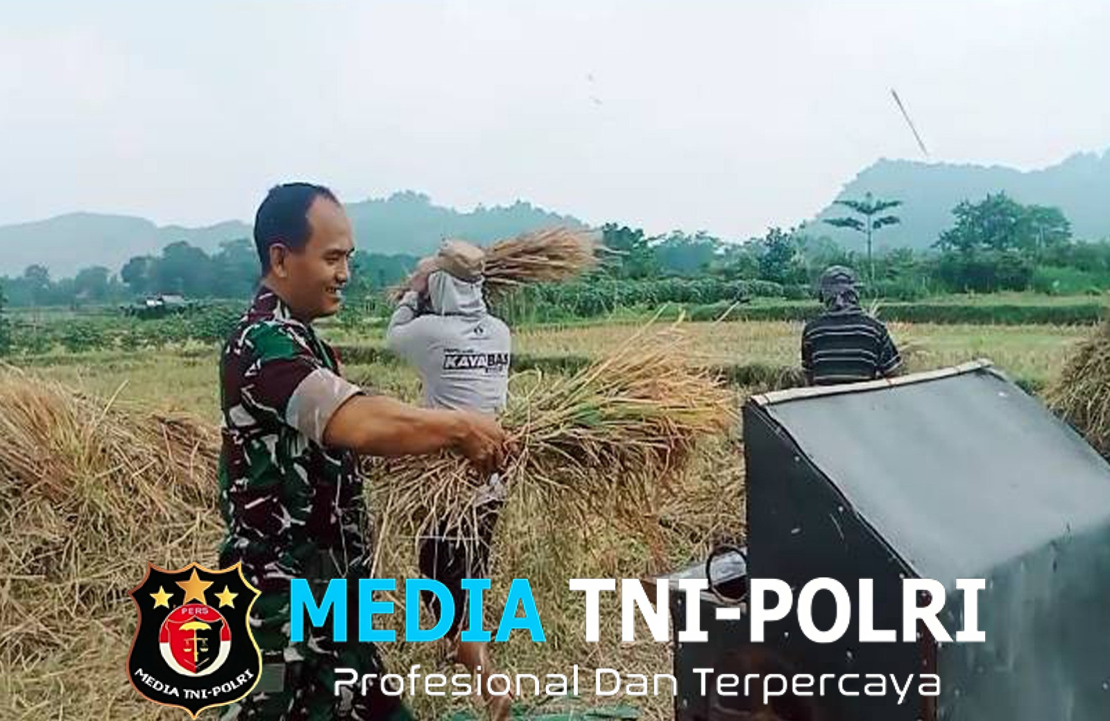 BLITAR // MEDIATNI-POLRI.COM / Dalam rangka mendukung program ketahanan pangan nasional, Babinsa Desa Kawedusan, Serda Lukman Haryanto dari Koramil 0808/07 Ponggok Kodim 0808/Blitar, aktif turun langsung ke lapangan untuk mendampingi para petani dalam kegiatan panen padi.