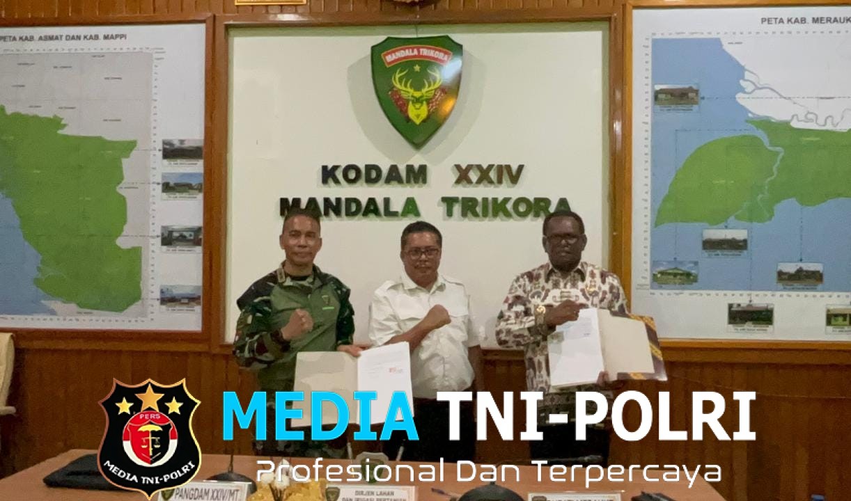 Penandatanganan yang turut disaksikan Direktorat Jenderal Lahan dan Irigasi Pertanian Kementerian Pertanian RI, Dr. Ir. Hermanto, M.P., berlangsung di Ruang Data Makodam XXIV/MT, Merauke, Papua Selatan. Kamis (04/12/2025).