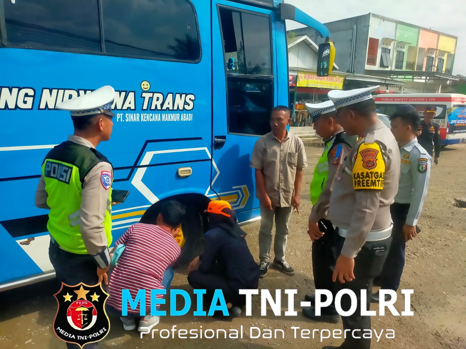 Petugas tampak memeriksa detail teknis kendaraan, mulai dari rem, lampu, kondisi ban, hingga perlengkapan darurat di dalam bus.