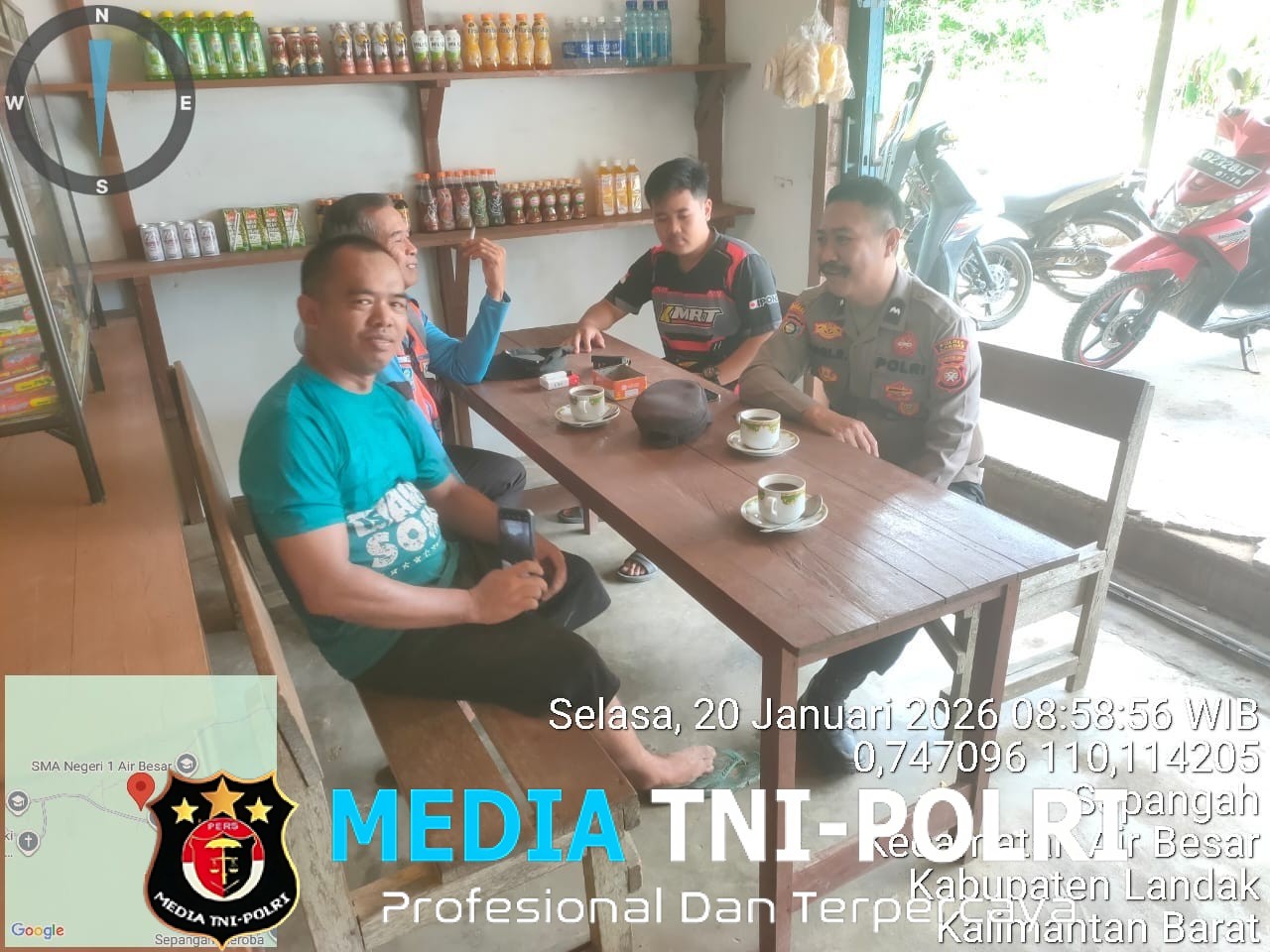 LANDAK // MEDIATNI-POLRI.COM / Polsek Air Besar ~ Polres Landak ~ Polda Kalbar ~ Berawal dari aroma kopi yang mengepul di sebuah warung sederhana, tercipta ruang kebersamaan antara polisi dan warga dalam menjaga keamanan lingkungan.