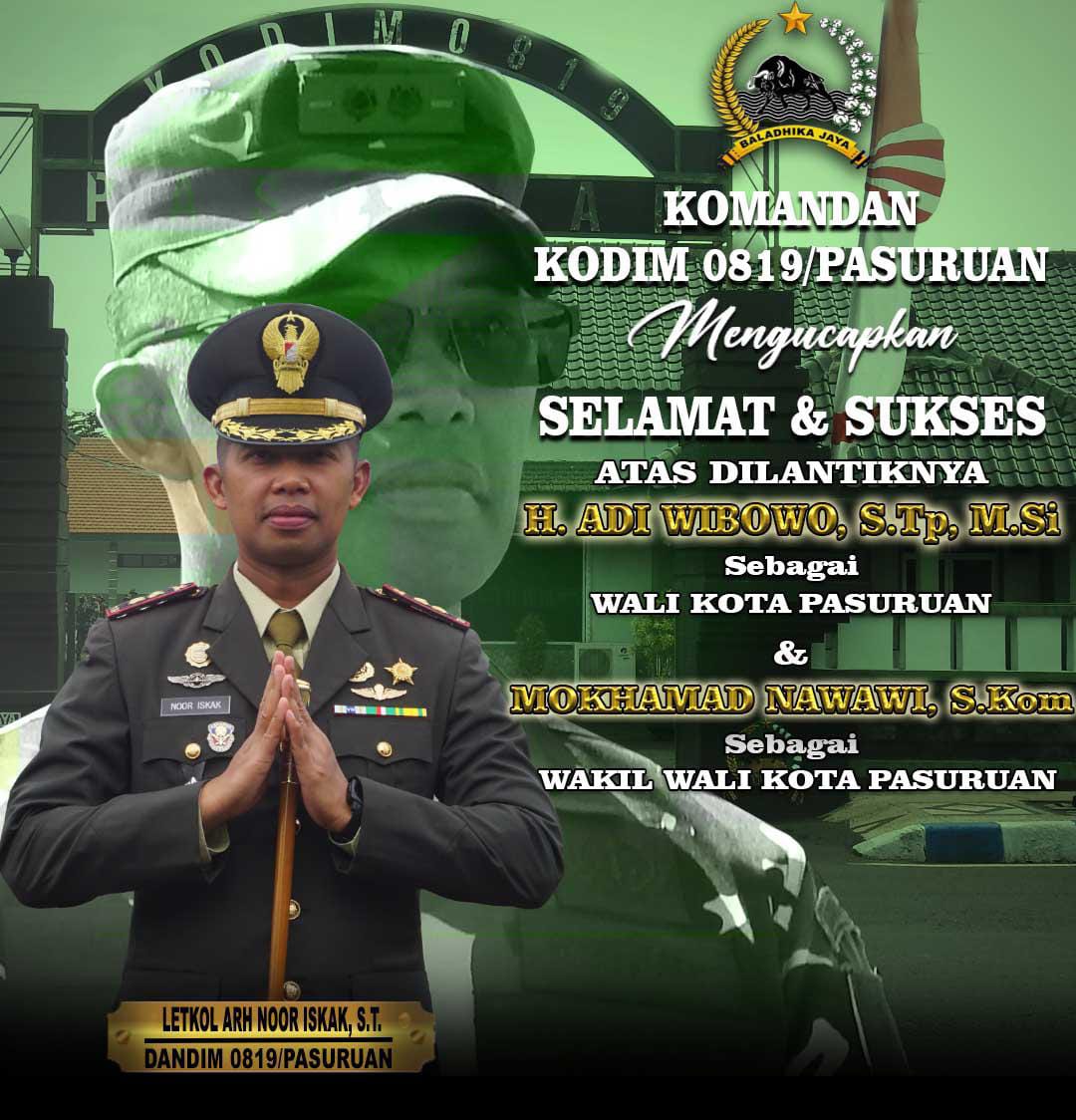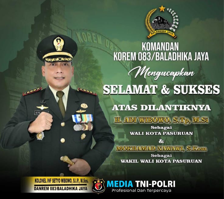 PASURUAN // MEDIATNI-POLRI.COM / Komandan Korem (Danrem) 083/Baladhika Jaya, Kolonel Inf Setyo Wibowo, S.I.P., M.Sos., dengan penuh semangat menyampaikan ucapan selamat atas pelantikan H. Adi Wibowo, S.TP., M.Si., sebagai Wali Kota Pasuruan dan M. Nawawi, S.Kom., sebagai Wakil Wali Kota Pasuruan periode 2025 – 2030.