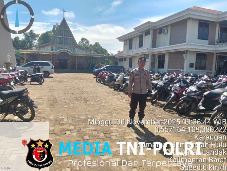 LANDAK // MEDIATNI-POLRI COM / Polres Landak melalui Polsek Mempawah Hulu Polda Kalbar Personel Polsek Mempawah Hulu melaksanakan pengamanan kegiatan ibadah misa minggu pagi di Gereja Santo Yusuf Karangan.